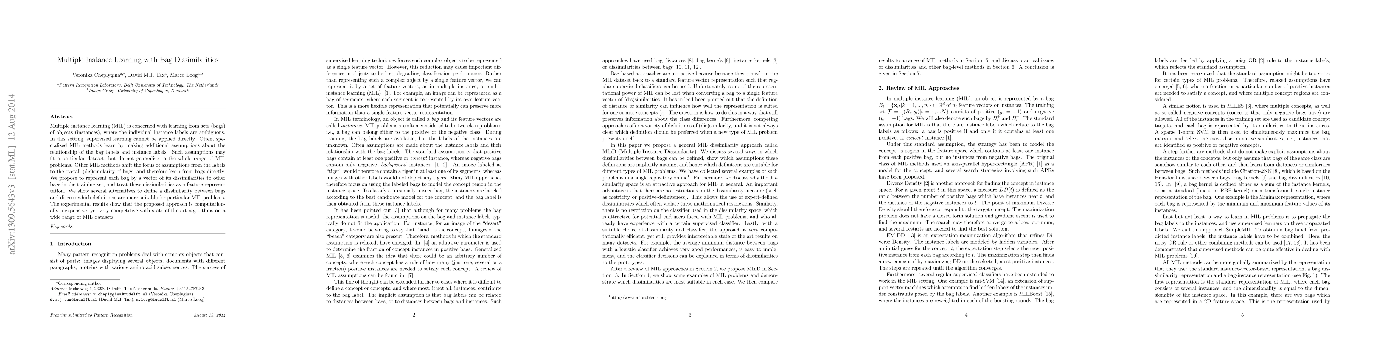 This paper proposes a novel approach to multiple instance learning (MIL) that represents each bag by a vector of its dissimilarities to other bags, showing competitive results with state-of-the-art algorithms on various MIL datasets.