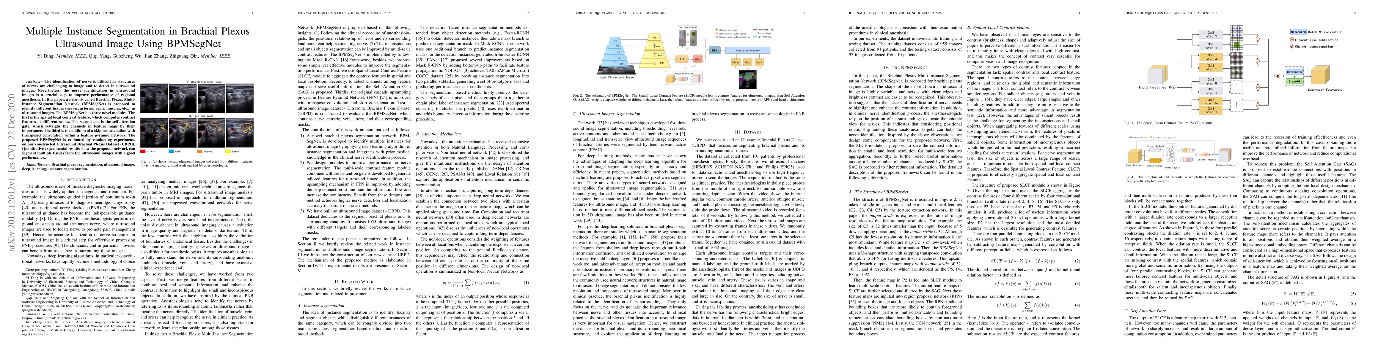 The identification of nerve is difficult as structures of nerves are challenging to image and to detect in ultrasound images. Nevertheless, the nerve identification in ultrasound images is a crucial step to improve performance of regional anesthesia. In this paper, a network called Brachial Plexus Multi-instance Segmentation Network (BPMSegNet) is proposed to identify different tissues (nerves, arteries, veins, muscles) in ultrasound images. The BPMSegNet has three novel modules. The first is the spatial local contrast feature, which computes contrast features at different scales. The second one is the self-attention gate, which reweighs the channels in feature maps by their importance. The third is the addition of a skip concatenation with transposed convolution within a feature pyramid network. The proposed BPMSegNet is evaluated by conducting experiments on our constructed Ultrasound Brachial Plexus Dataset (UBPD). Quantitative experimental results show the proposed network can segment multiple tissues from the ultrasound images with a good performance.