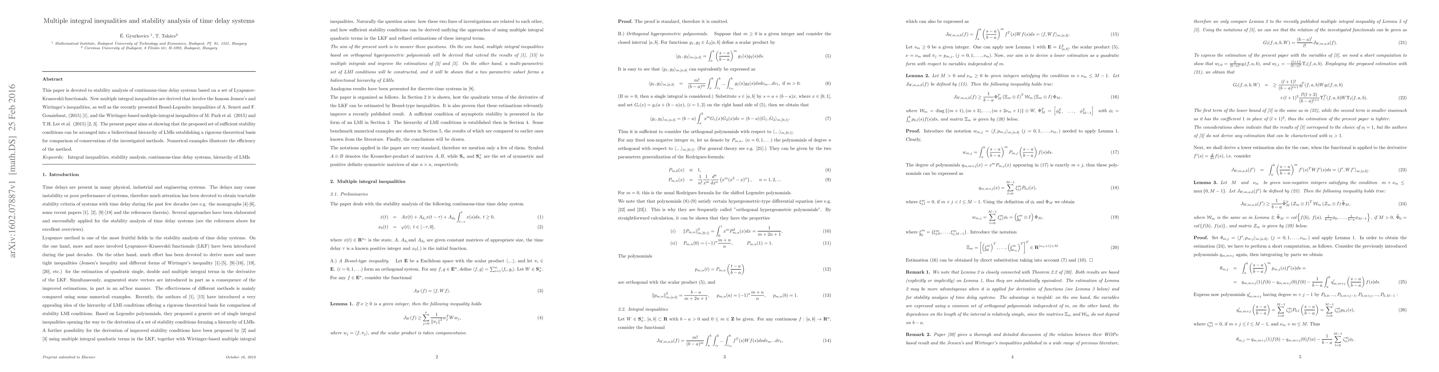 This paper develops stability analysis for continuous-time delay systems using Lyapunov-Krasovskii functionals and introduces new multiple integral inequalities based on Jensen's, Wirtinger's, and Bessel-Legendre inequalities. The proposed stability conditions are organized into a bidirectional hierarchy of LMIs for comparative analysis of method conservatism, validated through numerical examples.
