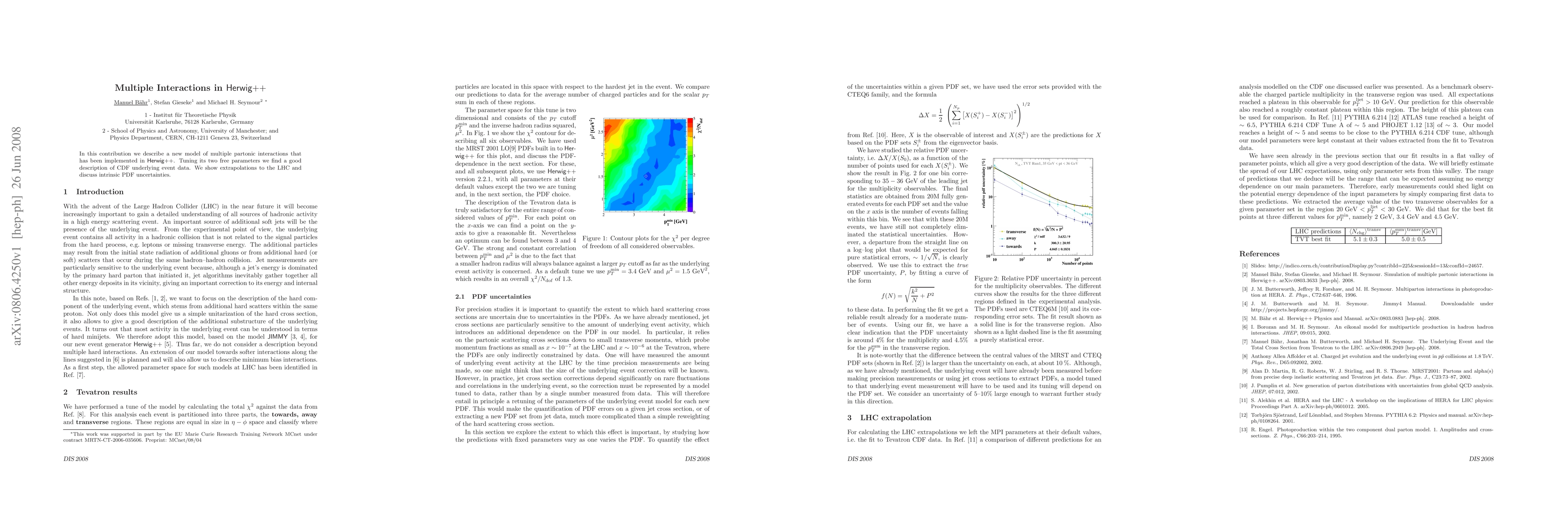 This paper introduces a new model for multiple partonic interactions implemented in Herwig++, achieving a good fit to CDF underlying event data by tuning its parameters. The study also extrapolates these findings to the LHC and examines associated parton distribution function (PDF) uncertainties.