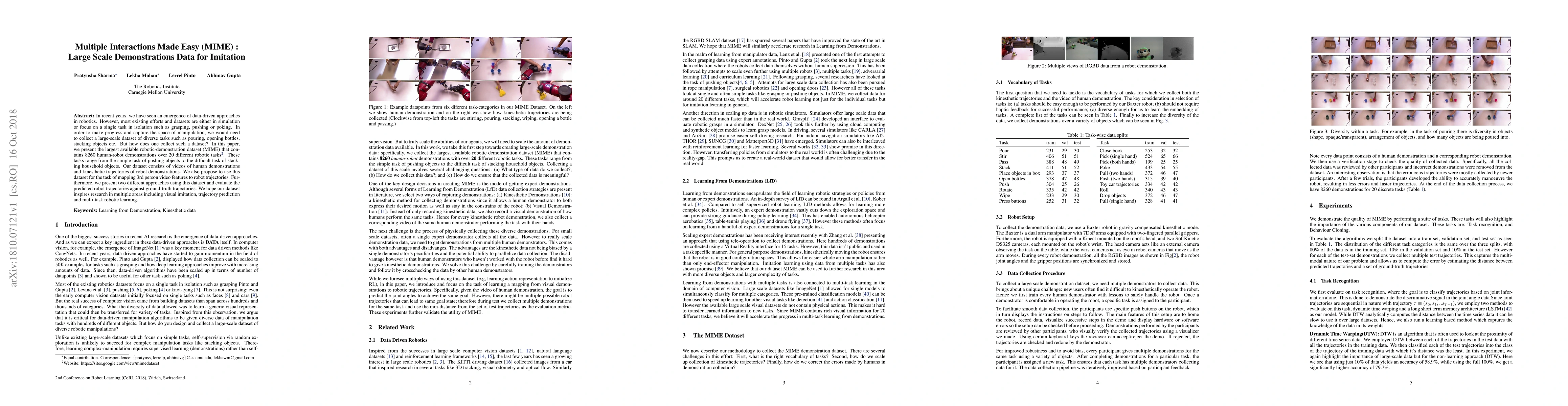 In recent years, we have seen an emergence of data-driven approaches in robotics. However, most existing efforts and datasets are either in simulation or focus on a single task in isolation such as grasping, pushing or poking. In order to make progress and capture the space of manipulation, we would need to collect a large-scale dataset of diverse tasks such as pouring, opening bottles, stacking objects etc. But how does one collect such a dataset? In this paper, we present the largest available robotic-demonstration dataset (MIME) that contains 8260 human-robot demonstrations over 20 different robotic tasks (https://sites.google.com/view/mimedataset). These tasks range from the simple task of pushing objects to the difficult task of stacking household objects. Our dataset consists of videos of human demonstrations and kinesthetic trajectories of robot demonstrations. We also propose to use this dataset for the task of mapping 3rd person video features to robot trajectories. Furthermore, we present two different approaches using this dataset and evaluate the predicted robot trajectories against ground-truth trajectories. We hope our dataset inspires research in multiple areas including visual imitation, trajectory prediction, and multi-task robotic learning.