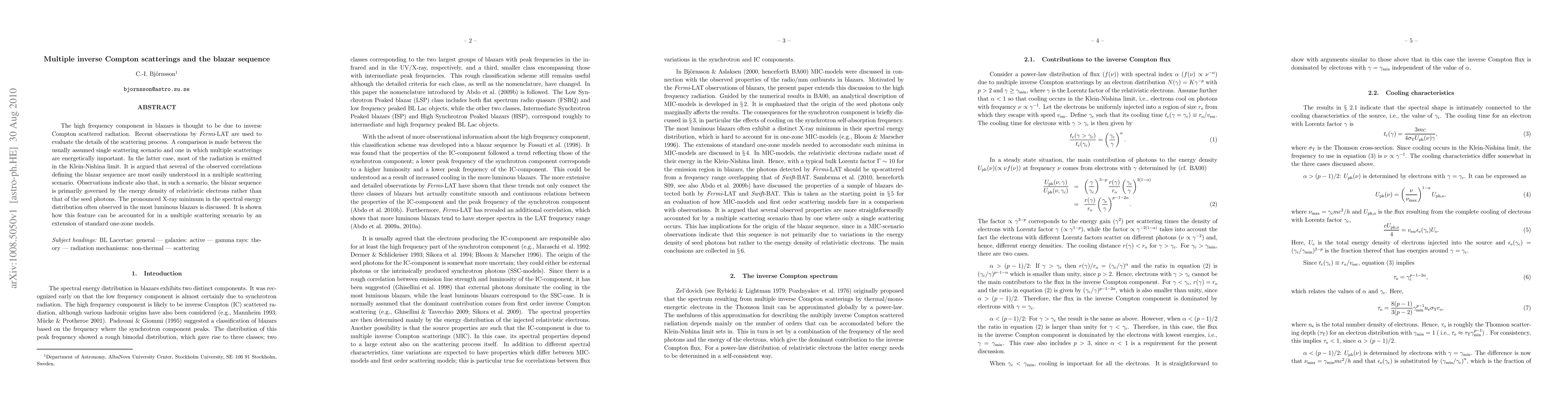 The high frequency component in blazars is thought to be due to inverse Compton scattered radiation. Recent observations by Fermi-LAT are used to evaluate the details of the scattering process. A comparison is made between the usually assumed single scattering scenario and one in which multiple scatterings are energetically important. In the latter case, most of the radiation is emitted in the Klein-Nishina limit. It is argued that several of the observed correlations defining the blazar sequence are most easily understood in a multiple scattering scenario. Observations indicate also that, in such a scenario, the blazar sequence is primarily governed by the energy density of relativistic electrons rather than that of the seed photons. The pronounced X-ray minimum in the spectral energy distribution often observed in the most luminous blazars is discussed. It is shown how this feature can be accounted for in a multiple scattering scenario by an extension of standard one-zone models.