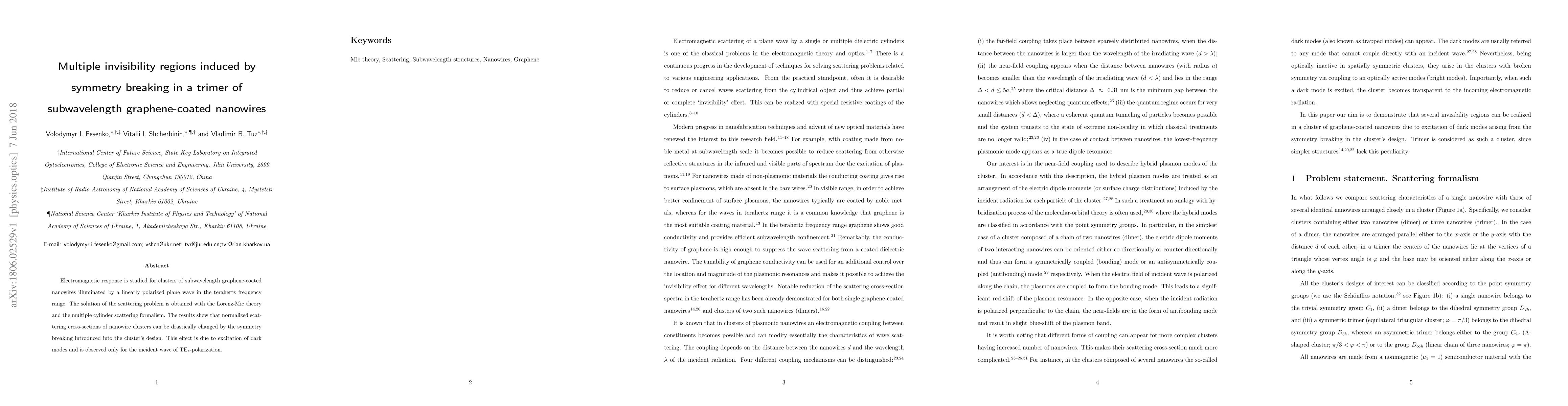 This research investigates how symmetry breaking in a trimer of subwavelength graphene-coated nanowires affects their electromagnetic response, revealing multiple invisibility regions through excitation of dark modes. The findings, obtained via Lorenz-Mie theory and multiple cylinder scattering formalism, indicate significant changes in scattering cross-sections, particularly for TE-polarized terahertz waves.