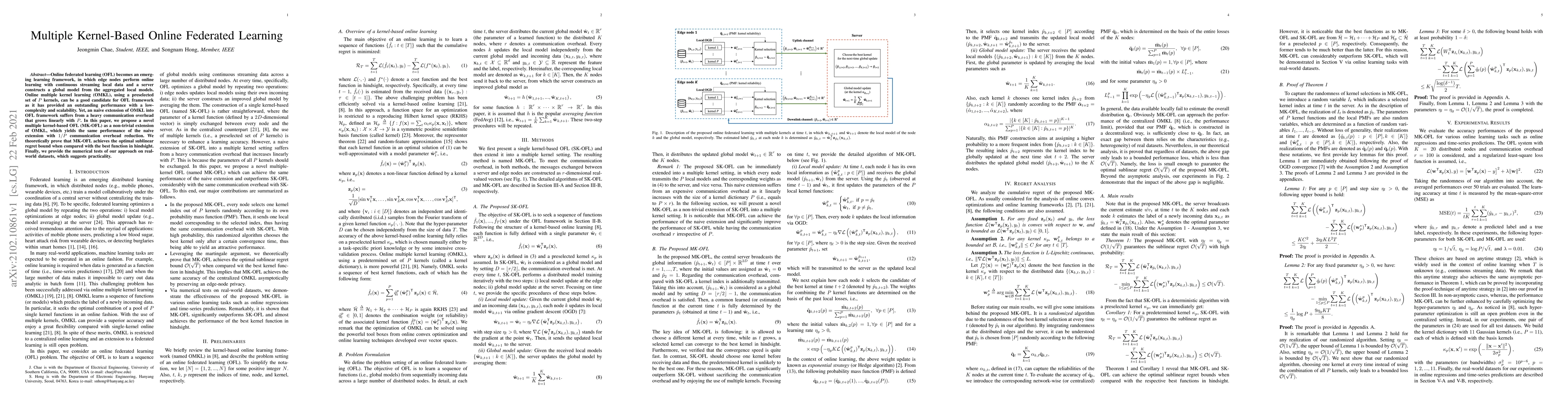 This paper proposes a novel multiple kernel-based online federated learning (MK-OFL) framework that reduces communication overhead by 1/P compared to a naive extension, while maintaining performance. Theoretical analysis shows optimal sublinear regret bounds, and practical tests on real datasets validate its effectiveness.