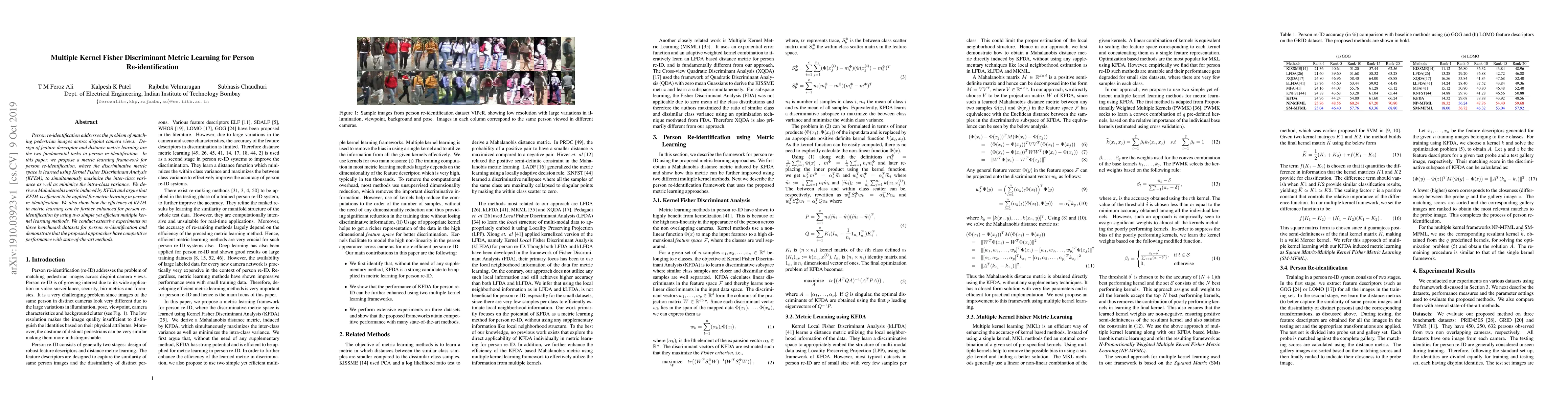 This paper proposes a metric learning framework using Kernel Fisher Discriminant Analysis (KFDA) for person re-identification, enhancing its efficiency with multiple kernel learning methods. Experiments show competitive performance against state-of-the-art methods on benchmark datasets.