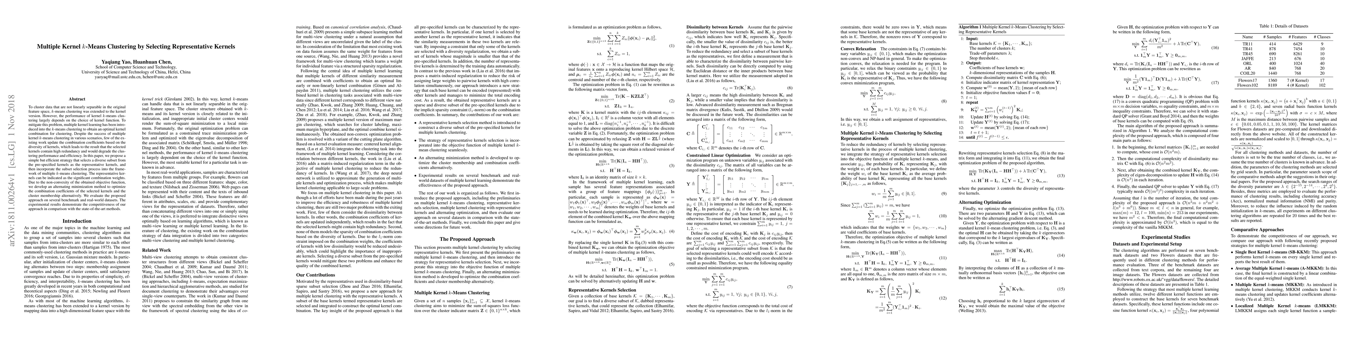 This paper proposes a method for selecting representative kernels in multiple kernel $k$-means clustering to reduce redundancy and improve performance. An alternating minimization technique optimizes the combination coefficients of selected kernels, demonstrating competitive results on benchmark datasets.