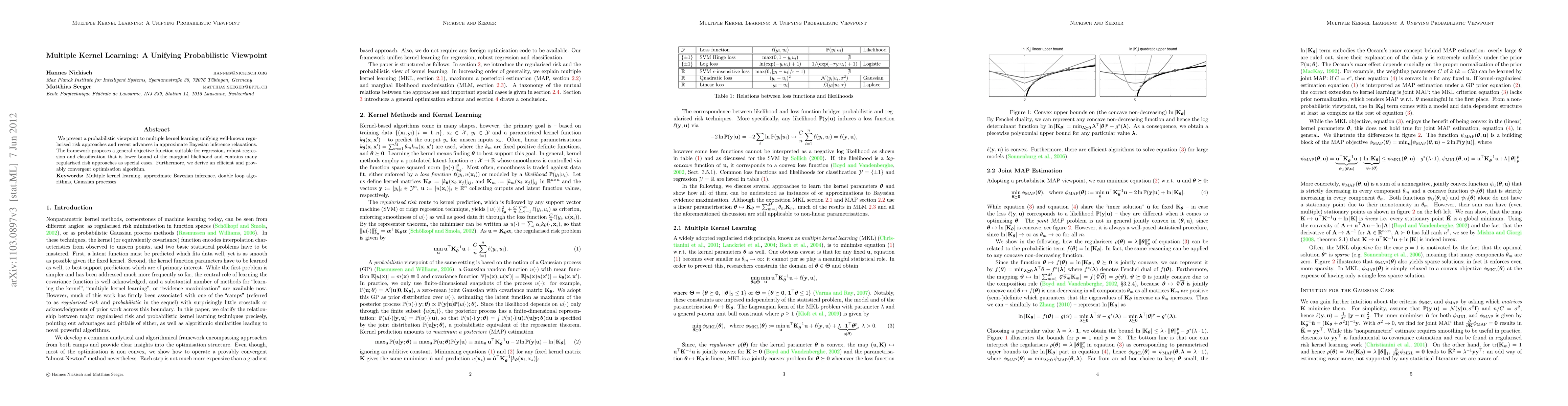 This paper introduces a probabilistic framework for multiple kernel learning that unifies various regularised risk methods and recent Bayesian inference techniques. It proposes a general objective function for regression, robust regression, and classification, which is a lower bound of the marginal likelihood and encompasses many existing methods.