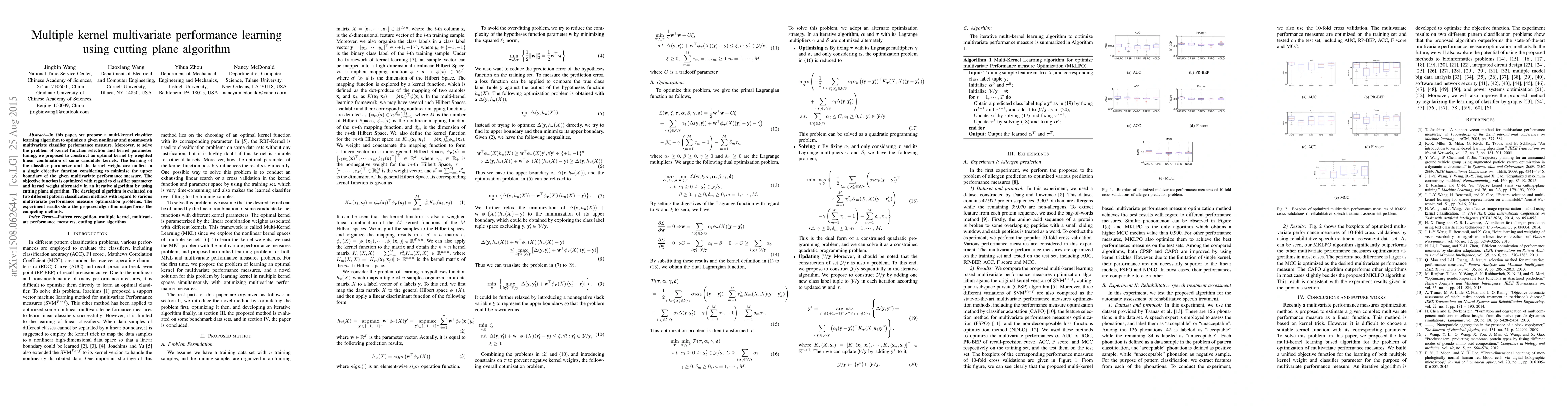 This paper introduces a multi-kernel classifier learning algorithm that optimizes nonlinear and nonsmooth multivariate performance measures. It combines candidate kernels using a cutting plane algorithm to iteratively optimize both classifier parameters and kernel weights, outperforming competing methods in pattern classification tasks.