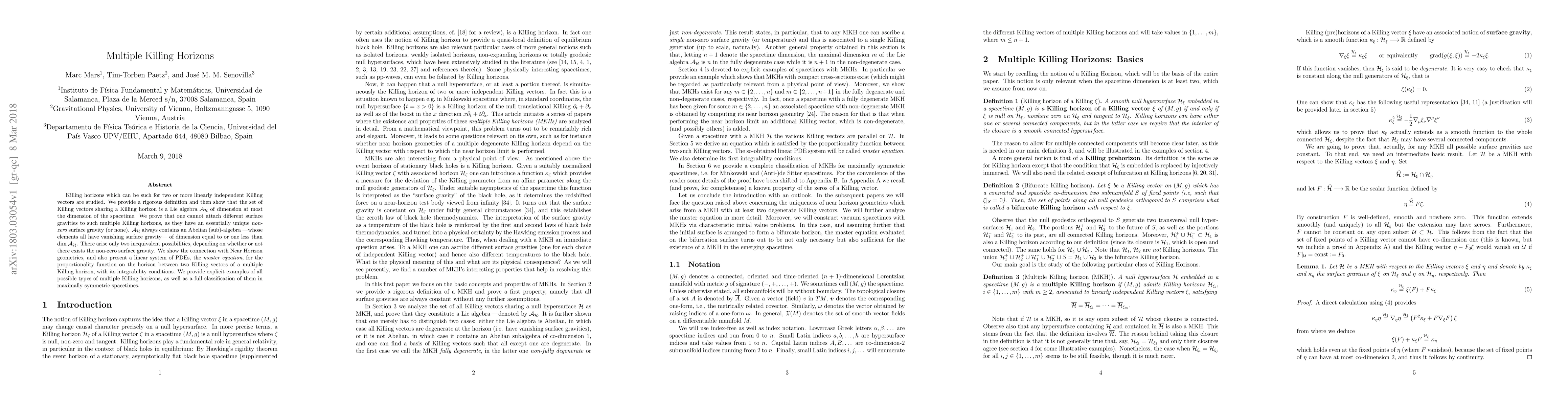 This paper rigorously defines multiple killing horizons, which are surfaces shared by two or more Killing vectors, and demonstrates that the associated Killing vectors form a Lie algebra. It shows that such horizons have a unique, non-zero surface gravity or none, and classifies their geometries in maximally symmetric spacetimes.