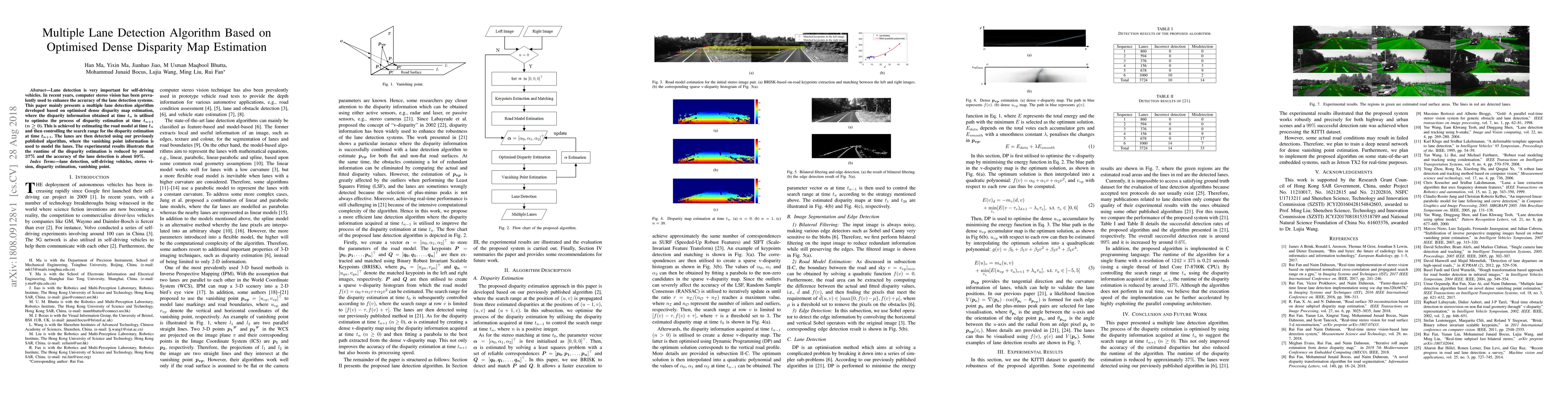 The research presents a multiple lane detection algorithm based on optimised dense disparity map estimation, utilising disparity information from time t_{n} to optimise disparity estimation at t_{n+1} by estimating the road model at t_{n} and controlling the search range for disparity estimation at t_{n+1}.