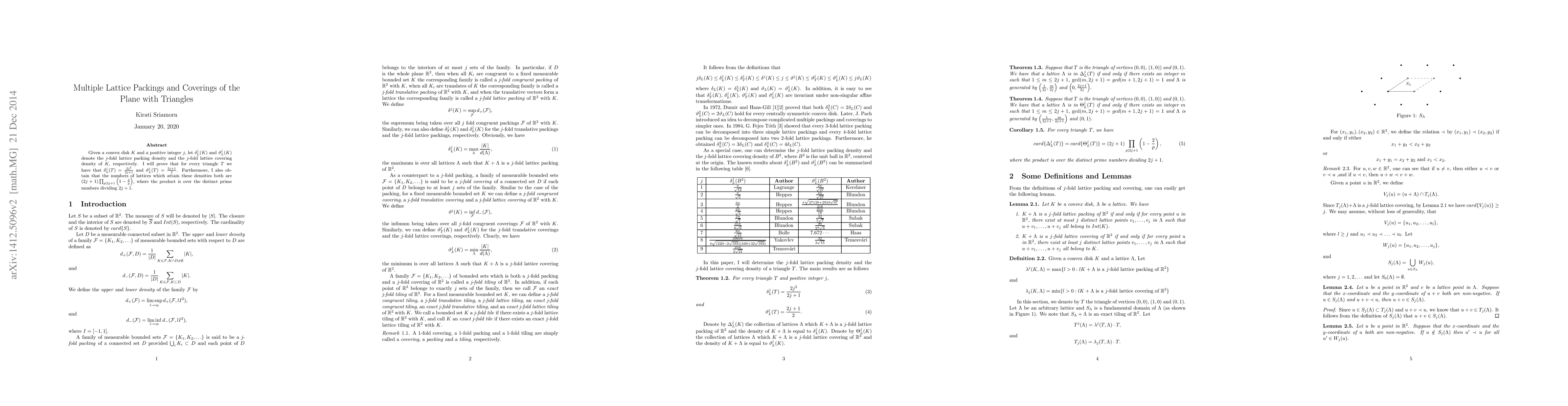 Given a convex disk $K$ and a positive integer $j$, let $\delta_L^j(K)$ and $\vartheta_L^j(K)$ denote the $j$-fold lattice packing density and the $j$-fold lattice covering density of $K$, respectively. I will prove that for every triangle $T$ we have that $\delta_L^j(T)=\frac{2j^2}{2j+1}$ and $\vartheta_L^j(T)=\frac{2j+1}{2}$. Furthermore, I also obtain that the numbers of lattices which attain these densities both are $(2j+1)\prod_{p|2j+1}(1-\frac{2}{p})$, where the product is over the distinct prime numbers dividing $2j+1$.