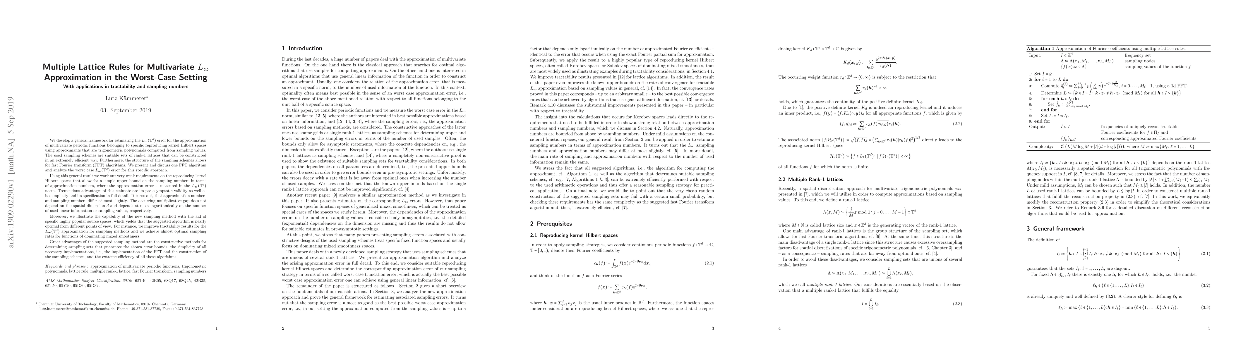 We develop a general framework for estimating the $L_\infty(\mathbb{T}^d)$ error for the approximation of multivariate periodic functions belonging to specific reproducing kernel Hilbert spaces (RHKS) using approximants that are trigonometric polynomials computed from sampling values. The used sampling schemes are suitable sets of rank-1 lattices that can be constructed in an extremely efficient way. Furthermore, the structure of the sampling schemes allows for fast Fourier transform (FFT) algorithms. We present and discuss one FFT algorithm and analyze the worst case $L_\infty$ error for this specific approach. Using this general result we work out very weak requirements on the RHKS that allow for a simple upper bound on the sampling numbers in terms of approximation numbers, where the approximation error is measured in the $L_\infty$ norm. Tremendous advantages of this estimate are its pre-asymptotic validity as well as its simplicity and its specification in full detail. It turns out, that approximation numbers and sampling numbers differ at most slightly. The occurring multiplicative gap does not depend on the spatial dimension $d$ and depends at most logarithmically on the number of used linear information or sampling values, respectively. Moreover, we illustrate the capability of the new sampling method with the aid of specific highly popular source spaces, which yields that the suggested algorithm is nearly optimal from different points of view. For instance, we improve tractability results for the $L_\infty$ approximation for sampling methods and we achieve almost optimal sampling rates for functions of dominating mixed smoothness. Great advantages of the suggested sampling method are the constructive methods for determining sampling sets that guarantee the shown error bounds, the simplicity and extreme efficiency of all necessary algorithms.