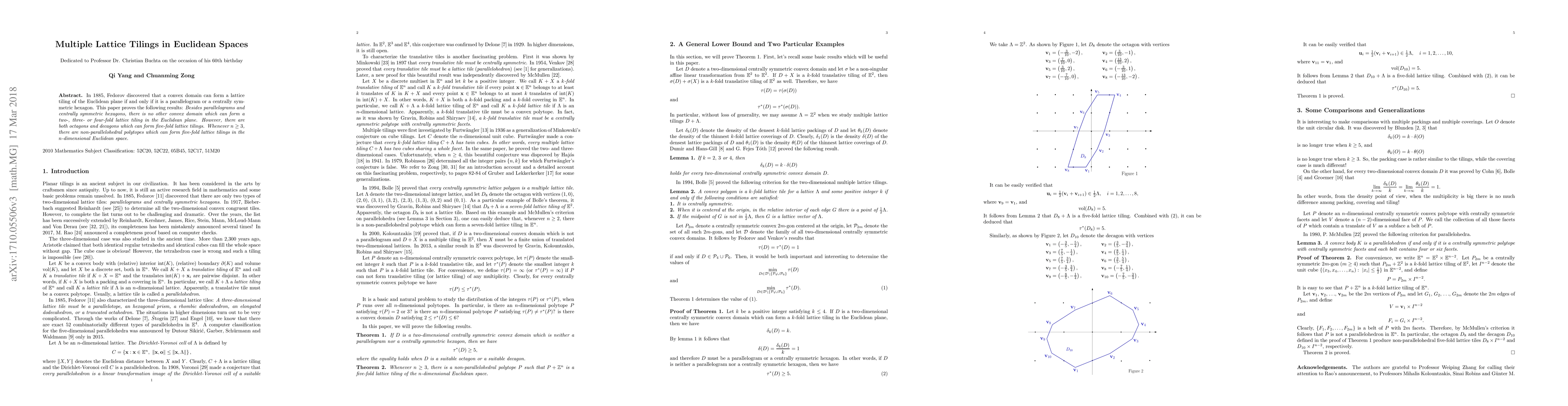 This paper proves the following results: Besides parallelograms and centrally symmetric hexagons, there is no other convex domain which can form a two-, three- or four-fold lattice tiling in the Euclidean plane. If a centrally symmetric octagon can form a lattice multiple tiling, then the multiplicity is at least seven. However, there are decagons which can form five-fold $($or six-fold$)$ lattice tilings. Consequently, whenever $n\ge 3$, there are non-parallelohedral polytopes which can form five-fold lattice tilings in the $n$-dimensional Euclidean space.