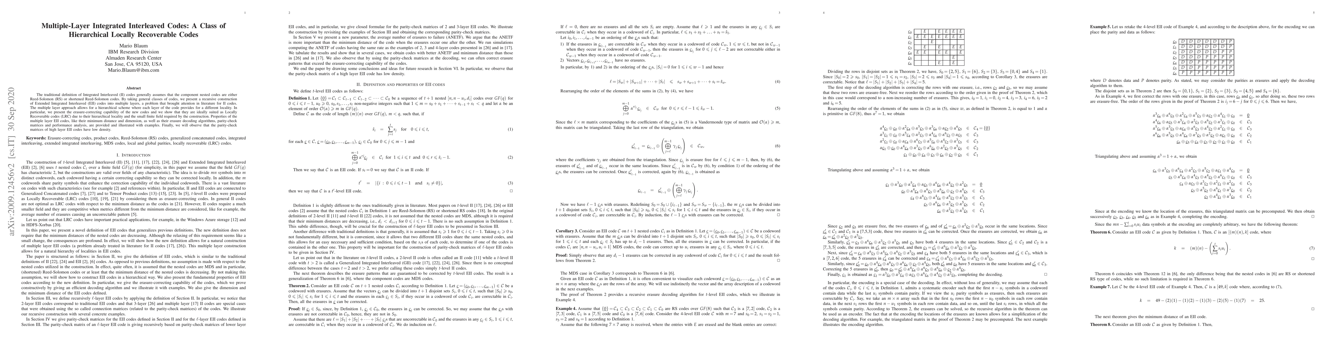 The traditional definition of Integrated Interleaved (II) codes generally assumes that the component nested codes are either Reed-Solomon (RS) or shortened Reed-Solomon codes. By taking general classes of codes, we present a recursive construction of Extended Integrated Interleaved (EII) codes into multiple layers, a problem that brought attention in literature for II codes. The multiple layer approach allows for a hierarchical scheme where each layer of the code provides for a different locality. In particular, we present the erasure-correcting capability of the new codes and we show that they are ideally suited as Locally Recoverable (LRC) codes due to their hierarchical locality and the small finite field required by the construction. Properties of the multiple layer EII codes, like their minimum distance and dimension, as well as their erasure decoding algorithms, parity-check matrices and performance analysis, are provided and illustrated with examples. Finally, we will observe that the parity-check matrices of high layer EII codes have low density.