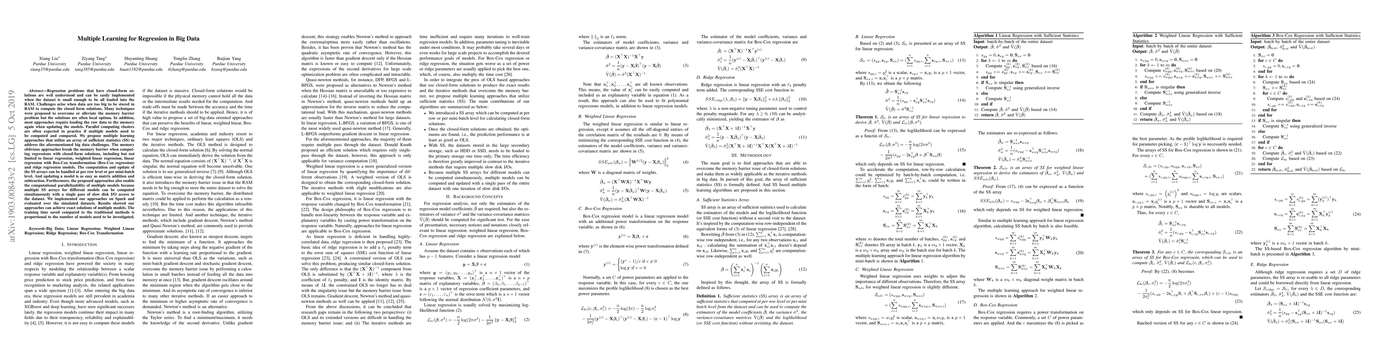 Regression problems that have closed-form solutions are well understood and can be easily implemented when the dataset is small enough to be all loaded into the RAM. Challenges arise when data is too big to be stored in RAM to compute the closed form solutions. Many techniques were proposed to overcome or alleviate the memory barrier problem but the solutions are often local optimal. In addition, most approaches require accessing the raw data again when updating the models. Parallel computing clusters are also expected if multiple models need to be computed simultaneously. We propose multiple learning approaches that utilize an array of sufficient statistics (SS) to address this big data challenge. This memory oblivious approach breaks the memory barrier when computing regressions with closed-form solutions, including but not limited to linear regression, weighted linear regression, linear regression with Box-Cox transformation (Box-Cox regression) and ridge regression models. The computation and update of the SS array can be handled at per row level or per mini-batch level. And updating a model is as easy as matrix addition and subtraction. Furthermore, multiple SS arrays for different models can be easily computed simultaneously to obtain multiple models at one pass through the dataset. We implemented our approaches on Spark and evaluated over the simulated datasets. Results showed our approaches can achieve closed-form solutions of multiple models at the cost of half training time of the traditional methods for a single model.