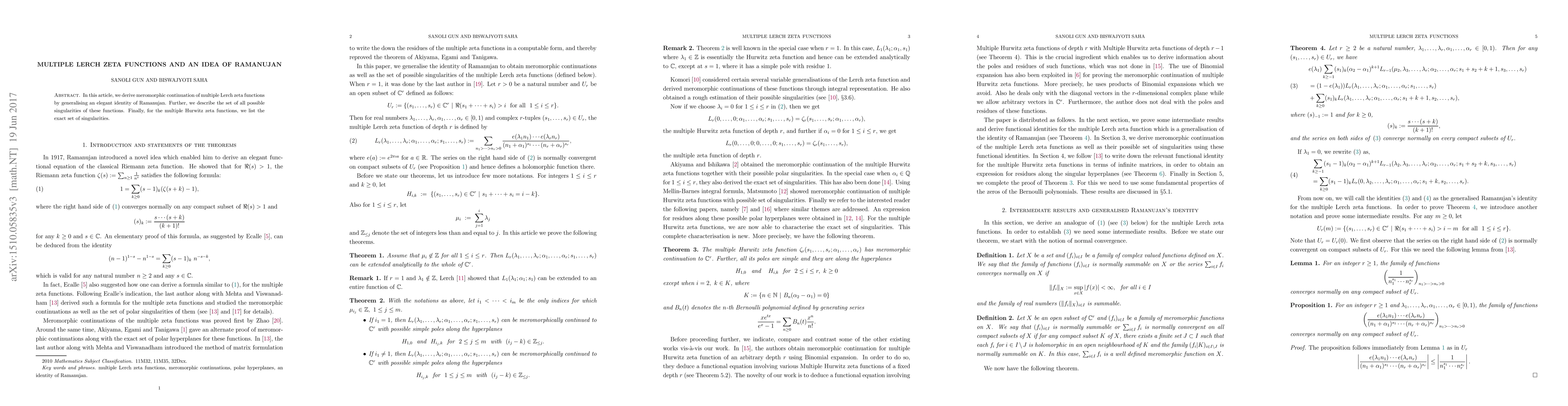This paper derives the meromorphic continuation of multiple Lerch zeta functions by generalizing Ramanujan's identity, and identifies the complete set of singularities for multiple Hurwitz zeta functions.