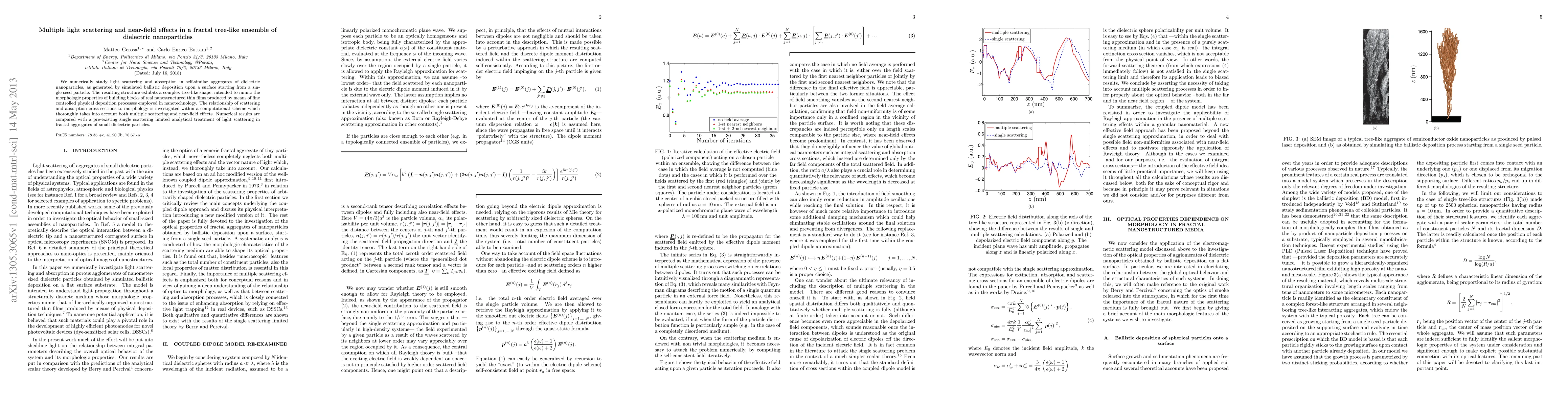 This paper numerically investigates light scattering and absorption in fractal tree-like aggregates of dielectric nanoparticles, focusing on multiple scattering and near-field effects. The study compares computational results with existing analytical models to understand the relationship between morphology and optical properties in nanostructured thin films.