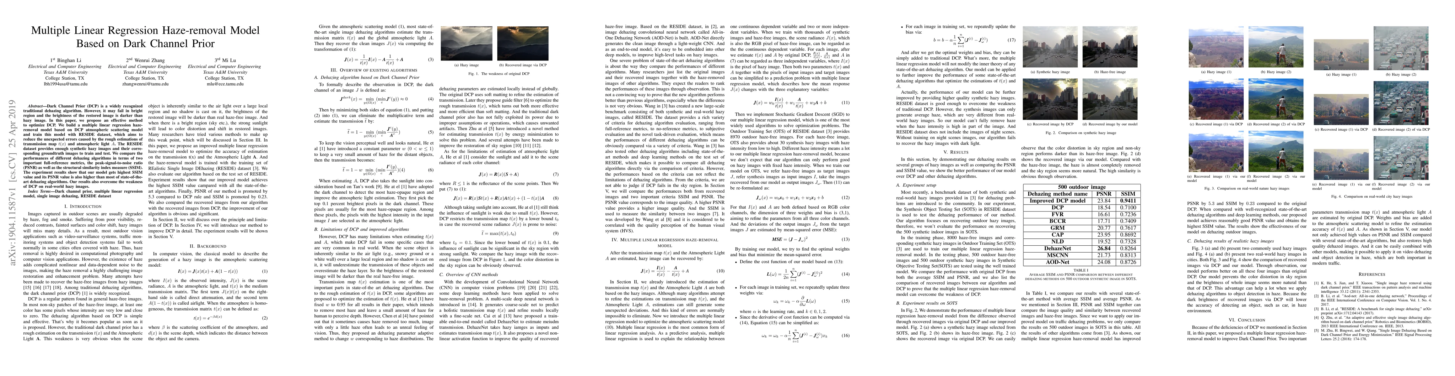 A new dehazing model is proposed that improves on the Dark Channel Prior algorithm by using a multiple linear regression haze-removal model based on atmospheric scattering. The model outperforms other algorithms in terms of structural similarity index measure and peak-signal-to-noise ratio.