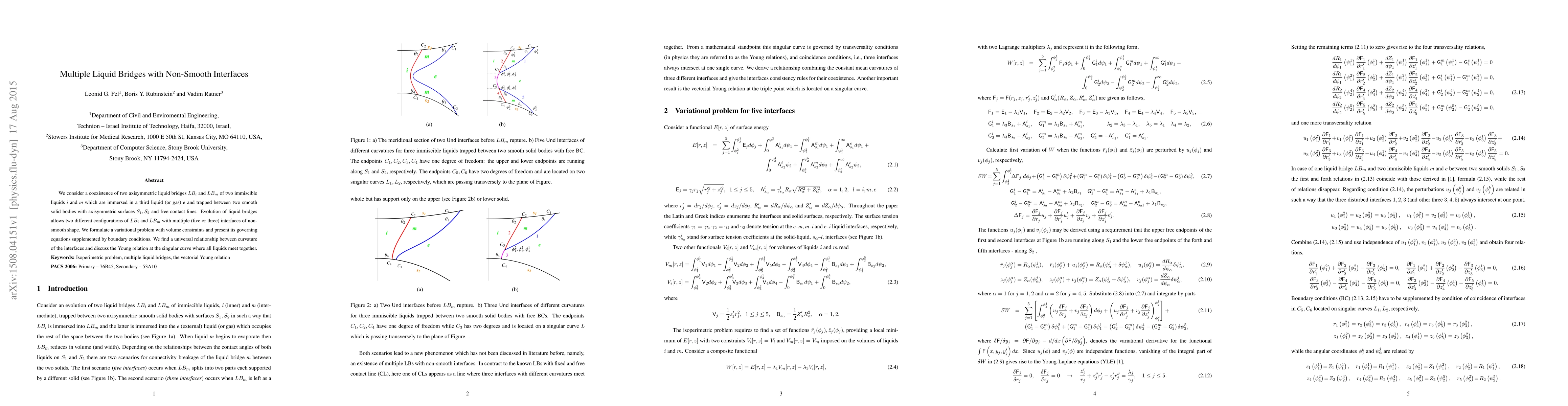 The paper presents a comprehensive mathematical framework for analyzing multiple liquid bridges with non-smooth interfaces, including variational problem formulation, governing equations, and boundary conditions.