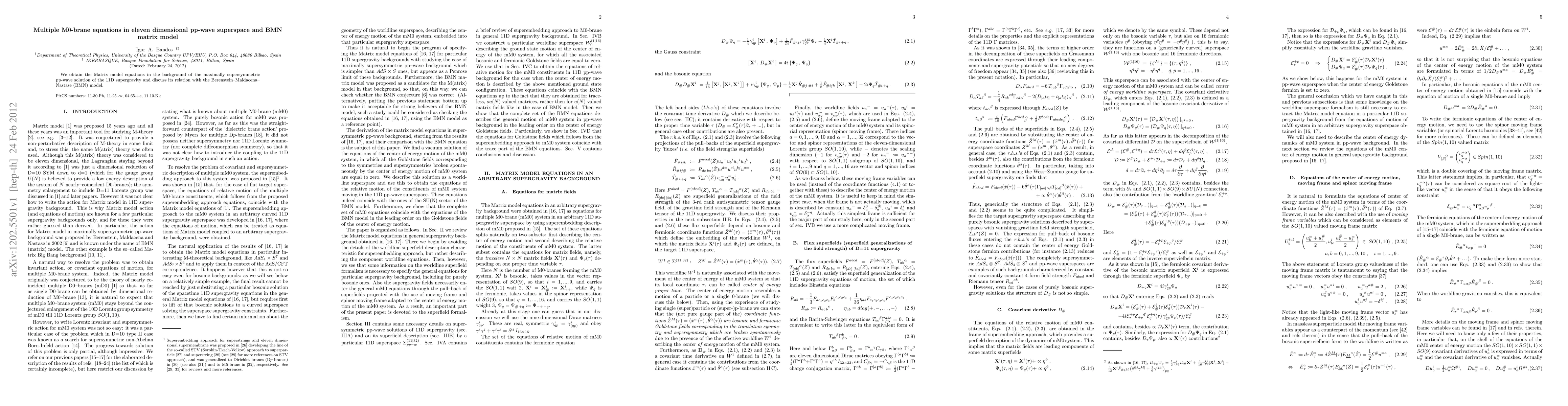 Summary: This paper derives Matrix model equations in the context of the maximally supersymmetric 11D pp-wave solution and explores its connection to the Berenstein-Maldacena-Nastase (BMN) matrix model. The study highlights the implications of this relation for understanding multiple M0-branes.