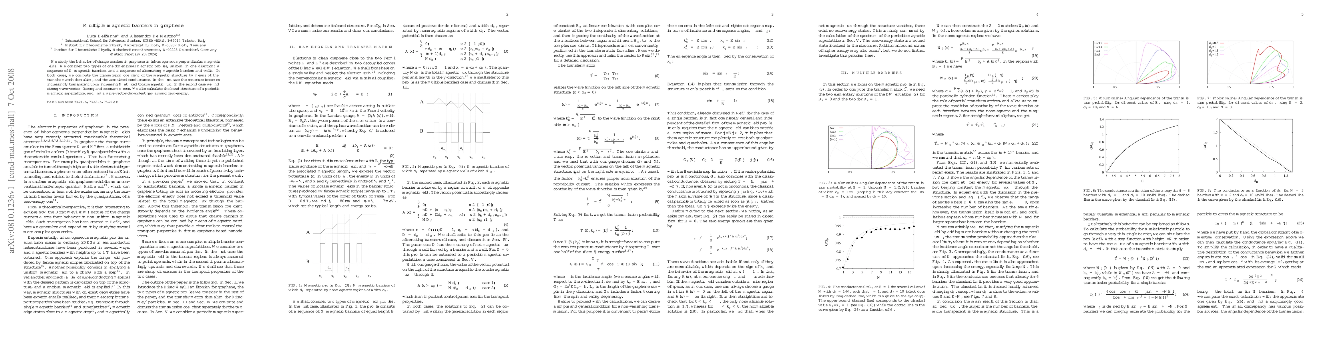 We study the behavior of charge carriers in graphene in inhomogeneous perpendicular magnetic fields. We consider two types of one-dimensional magnetic profiles, uniform in one direction: a sequence of N magnetic barriers, and a sequence of alternating magnetic barriers and wells. In both cases, we compute the transmission coefficient of the magnetic structure by means of the transfer matrix formalism, and the associated conductance. In the first case the structure becomes increasingly transparent upon increasing N at fixed total magnetic flux. In the second case we find strong wave-vector filtering and resonant effects. We also calculate the band structure of a periodic magnetic superlattice, and find a wave-vector-dependent gap around zero-energy.