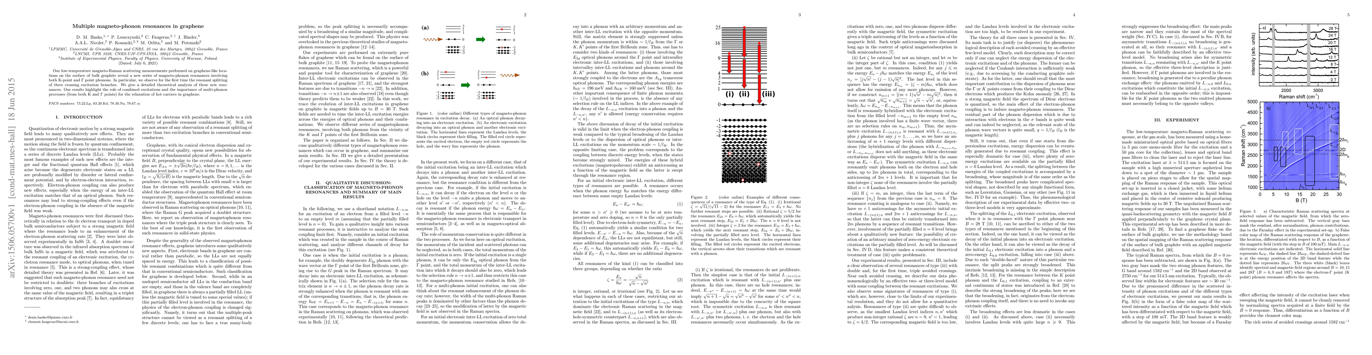 Summary: Low-temperature magneto-Raman scattering reveals new magneto-phonon resonances in graphene involving both K-point and Gamma-point phonons, with the first observation of resonant splitting of three crossing excitation branches, emphasizing the significance of multi-phonon processes for hot carrier relaxation.