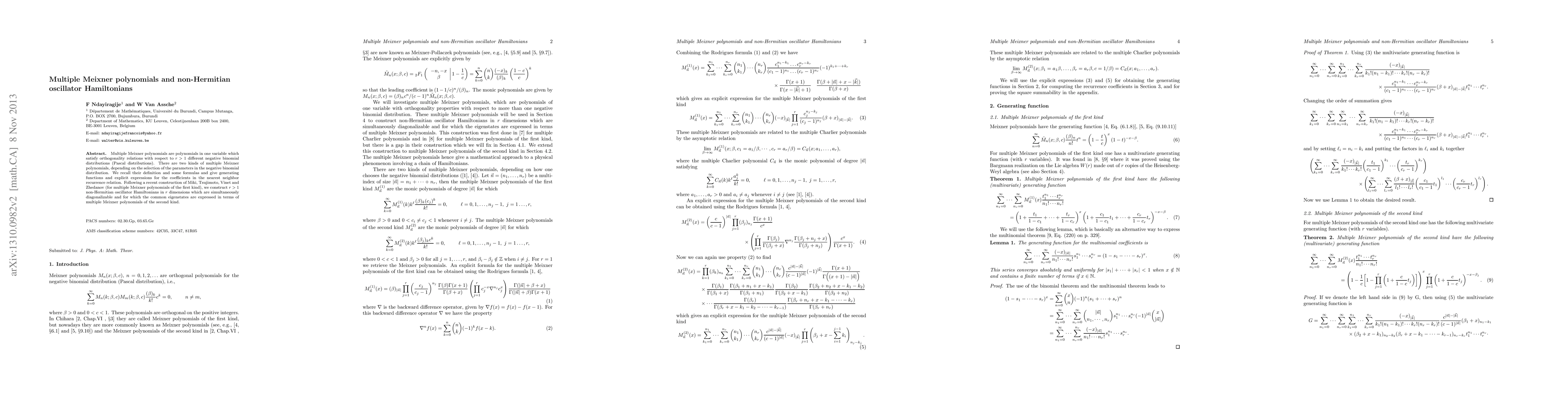 This paper explores multiple Meixner polynomials, which are orthogonal with respect to different negative binomial distributions, and constructs non-Hermitian oscillator Hamiltonians in multiple dimensions using these polynomials, showing their simultaneous diagonalizability and expressing common eigenstates in terms of the polynomials.