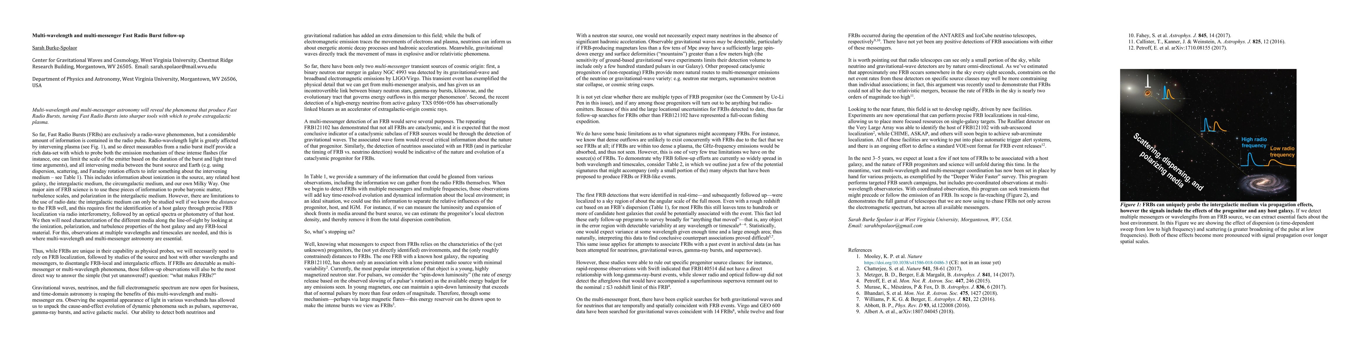 This paper discusses the use of multi-wavelength and multi-messenger observations of Fast Radio Bursts (FRBs) to identify their progenitors, determine host galaxy redshifts, and understand line-of-sight effects on FRB properties.