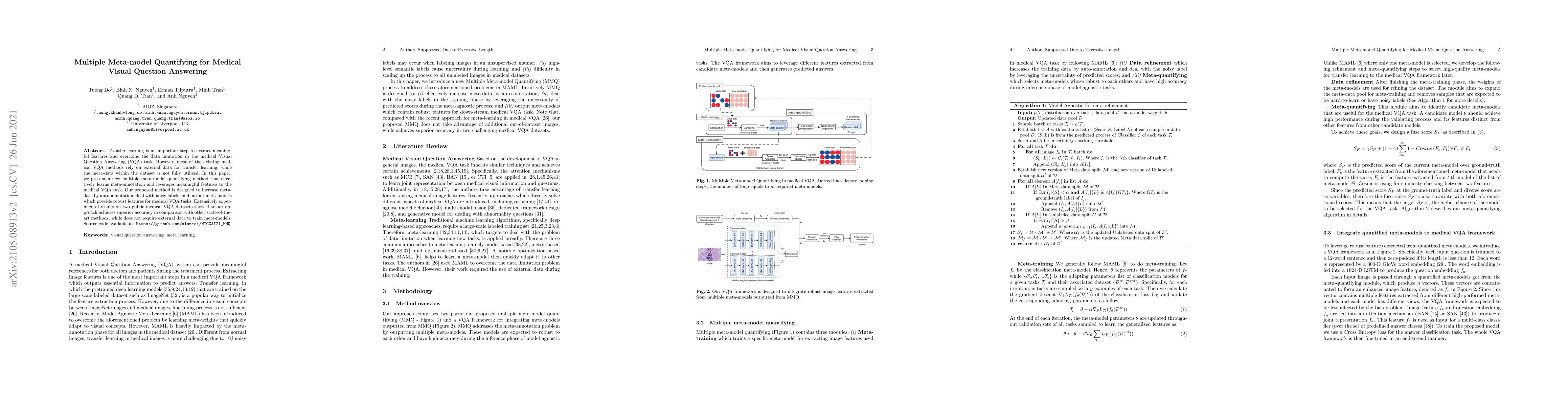 The paper presents a multiple meta-model quantifying method for medical Visual Question Answering (VQA) that leverages meta-data within the dataset through auto-annotation, dealing with noisy labels, and outputting meta-models for robust feature extraction without external data.