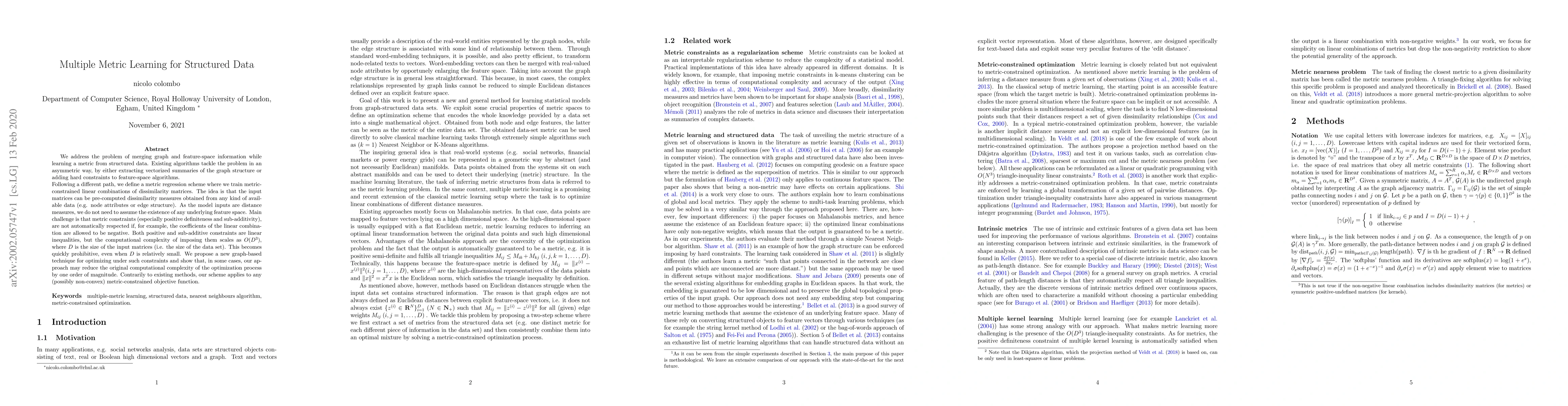 This paper proposes a novel metric regression scheme for learning from structured data by combining graph and feature-space information through metric-constrained linear combinations of dissimilarity matrices. The approach addresses the computational complexity of enforcing positive-definiteness and sub-additivity constraints, offering a graph-based optimization technique that can reduce the complexity by an order of magnitude compared to existing methods.