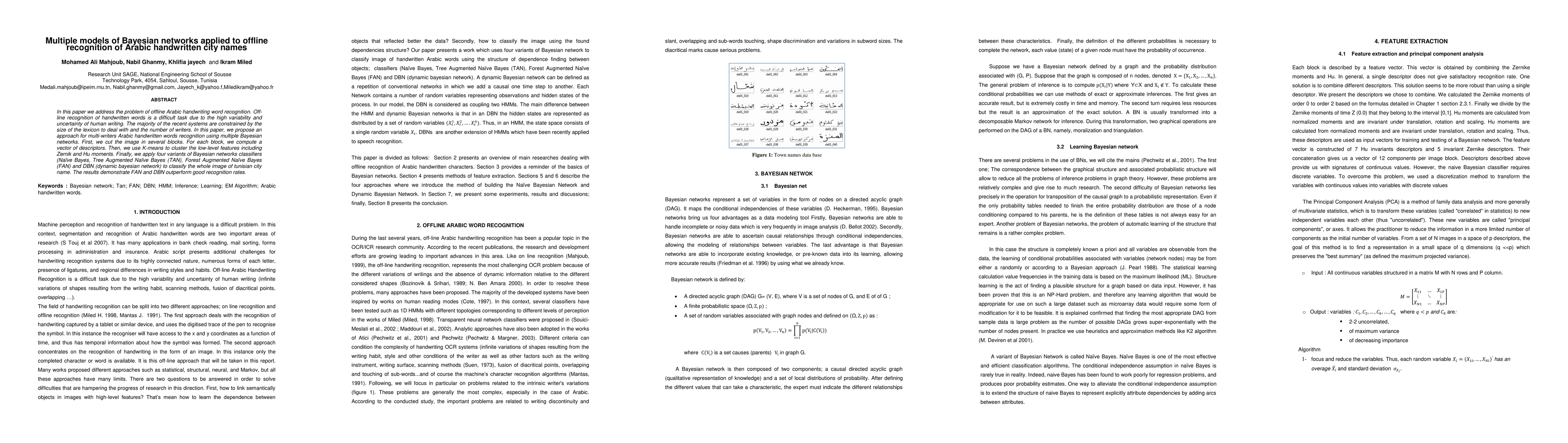 This paper proposes a multi-writer recognition system for offline Arabic handwritten city names using multiple Bayesian network models. It involves segmenting images into blocks, computing feature vectors, clustering low-level features, and applying various Bayesian classifiers for classification, with FAN and DBN achieving the best results.