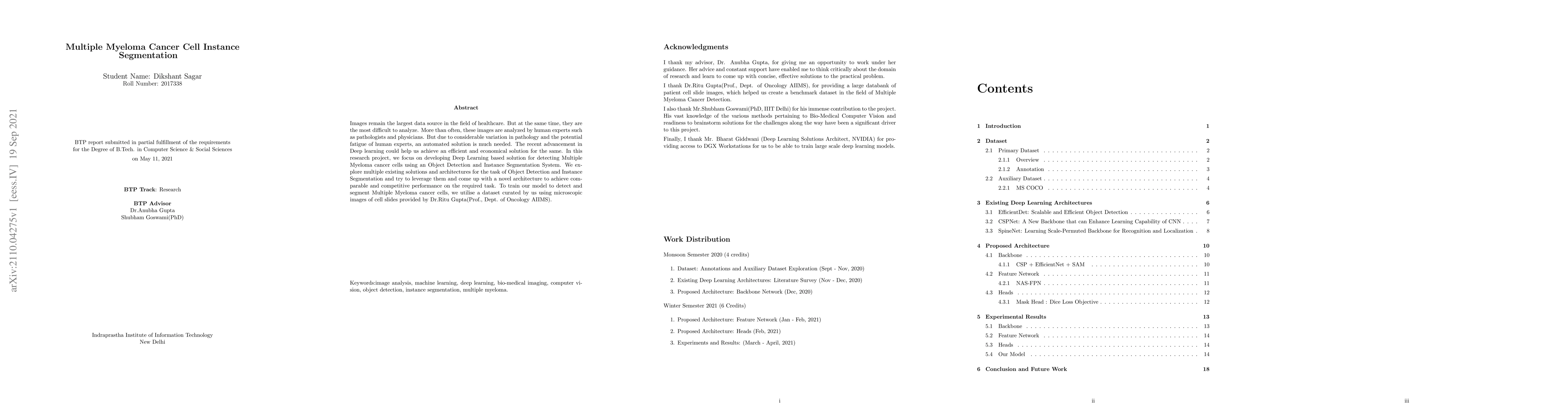 Images remain the largest data source in the field of healthcare. But at the same time, they are the most difficult to analyze. More than often, these images are analyzed by human experts such as pathologists and physicians. But due to considerable variation in pathology and the potential fatigue of human experts, an automated solution is much needed. The recent advancement in Deep learning could help us achieve an efficient and economical solution for the same. In this research project, we focus on developing a Deep Learning-based solution for detecting Multiple Myeloma cancer cells using an Object Detection and Instance Segmentation System. We explore multiple existing solutions and architectures for the task of Object Detection and Instance Segmentation and try to leverage them and come up with a novel architecture to achieve comparable and competitive performance on the required task. To train our model to detect and segment Multiple Myeloma cancer cells, we utilize a dataset curated by us using microscopic images of cell slides provided by Dr.Ritu Gupta(Prof., Dept. of Oncology AIIMS).