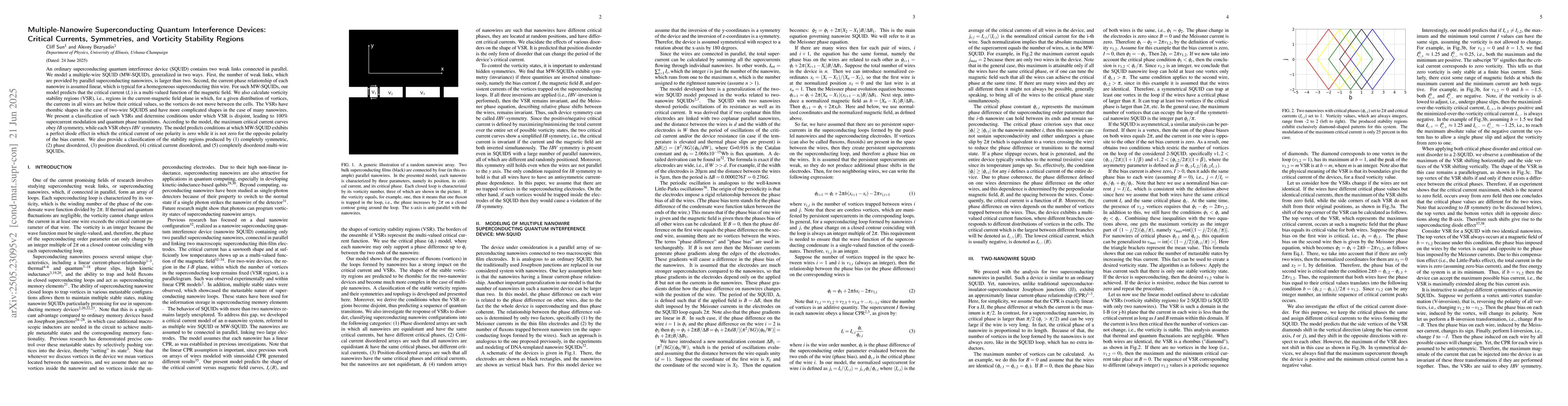 The research models multiple-wire SQUIDs (MW-SQUIDs) with a larger number of weak links provided by superconducting nanowires, assuming linear current-phase relationships. It predicts critical current ($I_c$) as a multi-valued function of magnetic field and calculates vorticity stability regions (VSRs) with varying symmetries.