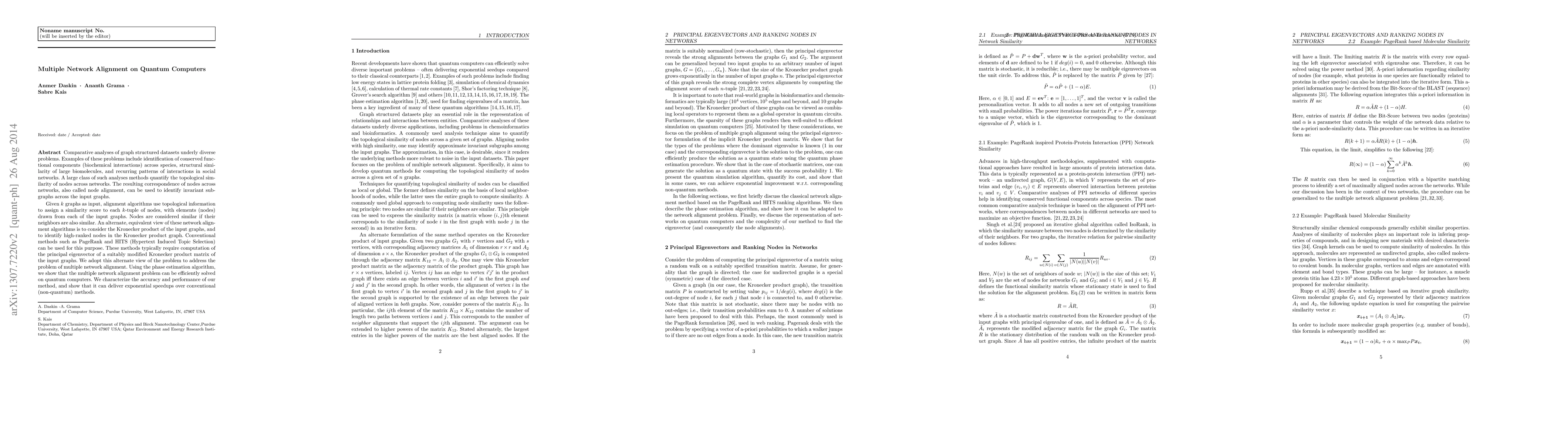 Comparative analyses of graph structured datasets underly diverse problems. Examples of these problems include identification of conserved functional components (biochemical interactions) across species, structural similarity of large biomolecules, and recurring patterns of interactions in social networks. A large class of such analyses methods quantify the topological similarity of nodes across networks. The resulting correspondence of nodes across networks, also called node alignment, can be used to identify invariant subgraphs across the input graphs. Given $k$ graphs as input, alignment algorithms use topological information to assign a similarity score to each $k$-tuple of nodes, with elements (nodes) drawn from each of the input graphs. Nodes are considered similar if their neighbors are also similar. An alternate, equivalent view of these network alignment algorithms is to consider the Kronecker product of the input graphs, and to identify high-ranked nodes in the Kronecker product graph. Conventional methods such as PageRank and HITS (Hypertext Induced Topic Selection) can be used for this purpose. These methods typically require computation of the principal eigenvector of a suitably modified Kronecker product matrix of the input graphs. We adopt this alternate view of the problem to address the problem of multiple network alignment. Using the phase estimation algorithm, we show that the multiple network alignment problem can be efficiently solved on quantum computers. We characterize the accuracy and performance of our method, and show that it can deliver exponential speedups over conventional (non-quantum) methods.