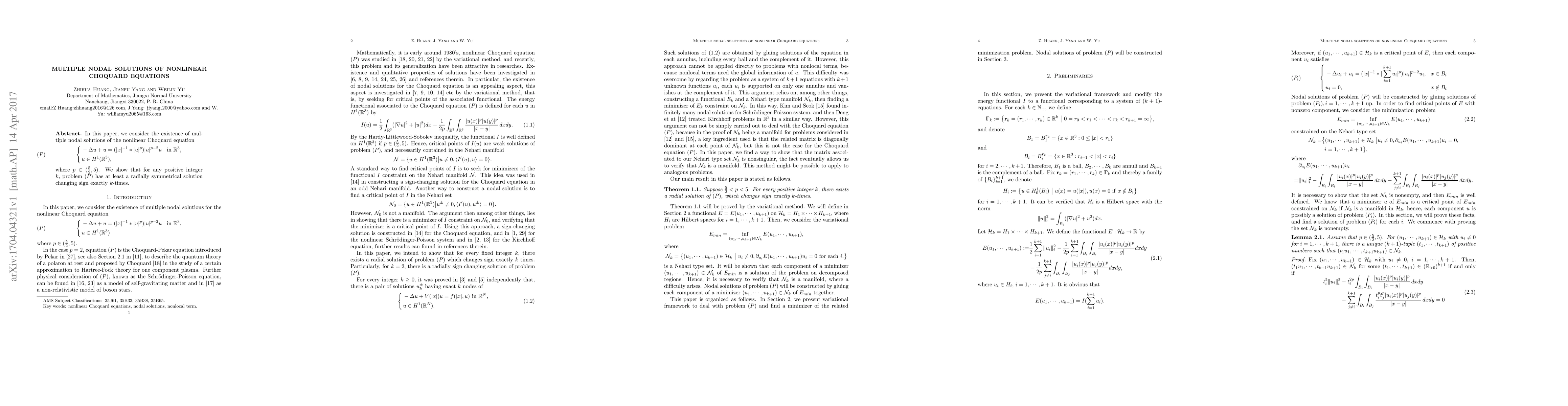 The paper proves that a nonlinear Choquard equation has at least one radially symmetrical solution with k sign changes for any positive integer k, in the range of p=5/2 to 5.