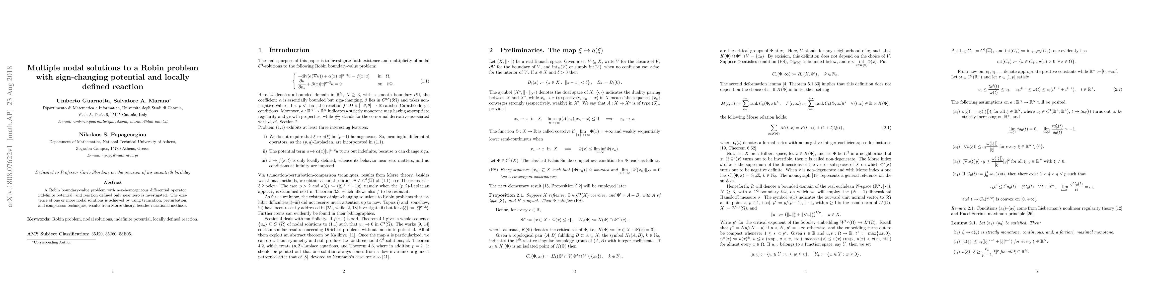 Summary: The paper investigates the existence of multiple nodal solutions for a Robin boundary-value problem featuring an indefinite potential and a locally defined reaction, utilizing truncation, perturbation, and variational methods, alongside results from Morse theory.