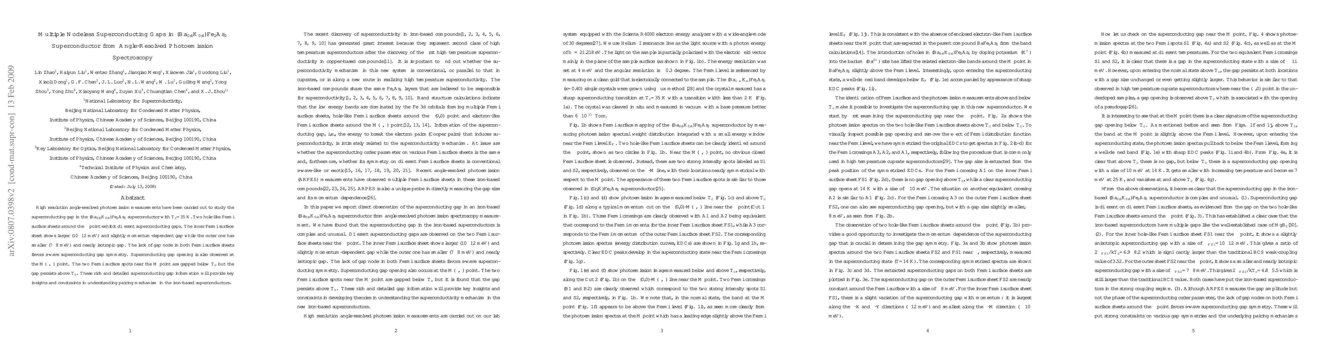 This study reveals multiple nodeless superconducting gaps in (Ba0.6K0.4)Fe2As2 using angle-resolved photoemission spectroscopy, showing distinct gaps on inner and outer Fermi surface sheets, and suggesting s-wave symmetry. The findings provide crucial insights into the pairing mechanism in iron-based superconductors.