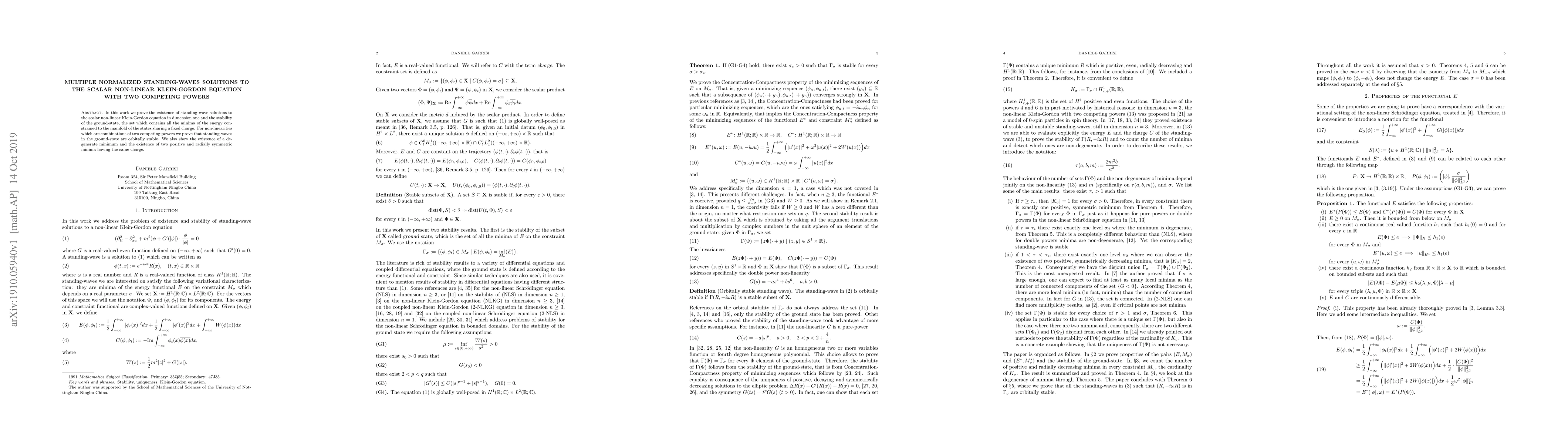 This paper proves the existence of stable standing-wave solutions to the scalar non-linear Klein-Gordon equation in one dimension, demonstrating orbital stability for ground-state solutions with competing power non-linearities. It also reveals a degenerate minimum and two positive, radially symmetric minima sharing the same charge.
