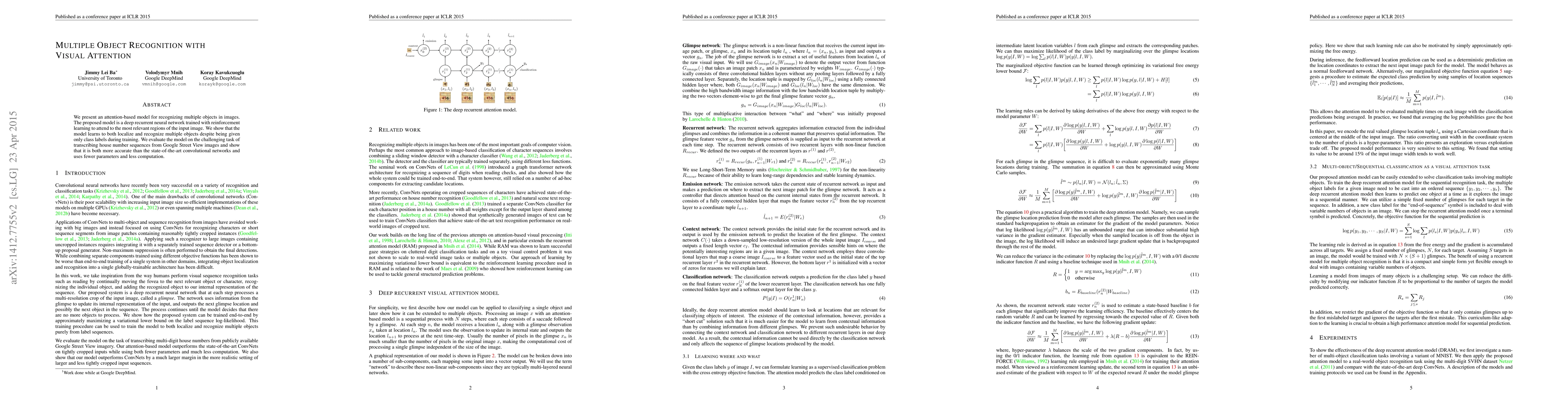 We present an attention-based model for recognizing multiple objects in images. The proposed model is a deep recurrent neural network trained with reinforcement learning to attend to the most relevant regions of the input image. We show that the model learns to both localize and recognize multiple objects despite being given only class labels during training. We evaluate the model on the challenging task of transcribing house number sequences from Google Street View images and show that it is both more accurate than the state-of-the-art convolutional networks and uses fewer parameters and less computation.