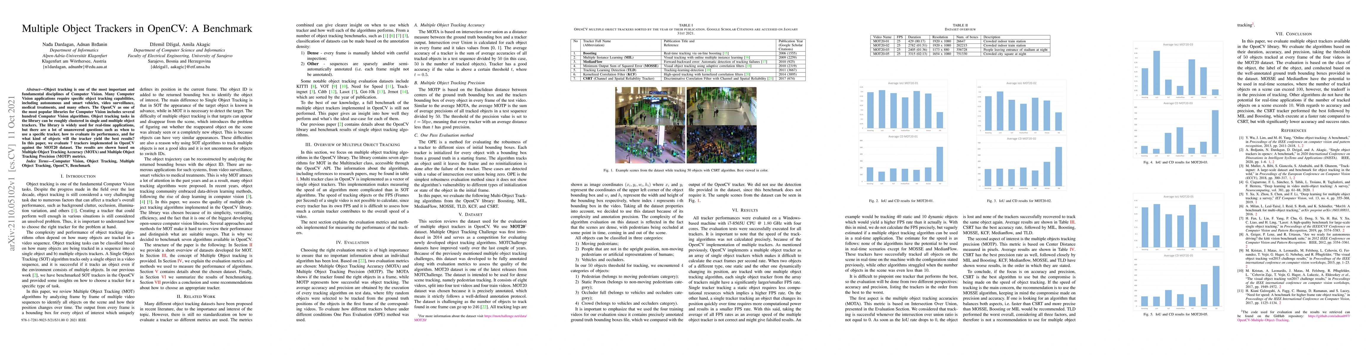 This paper benchmarks 7 multiple object trackers in OpenCV using the MOT20 dataset, evaluating their performance based on Multiple Object Tracking Accuracy (MOTA) and Precision (MOTP) to determine when and for which objects each tracker is most effective.