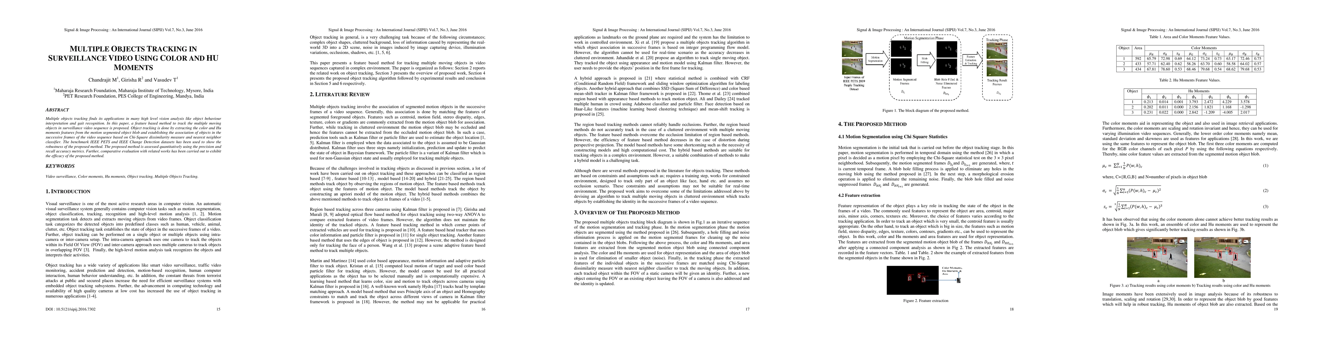 This paper proposes a feature-based method for tracking multiple objects in surveillance videos using color and Hu moments, employing a Chi-Square dissimilarity measure and nearest neighbor classifier. The method's robustness is demonstrated using IEEE PETS and Change Detection datasets, with quantitative assessments based on precision and recall metrics.