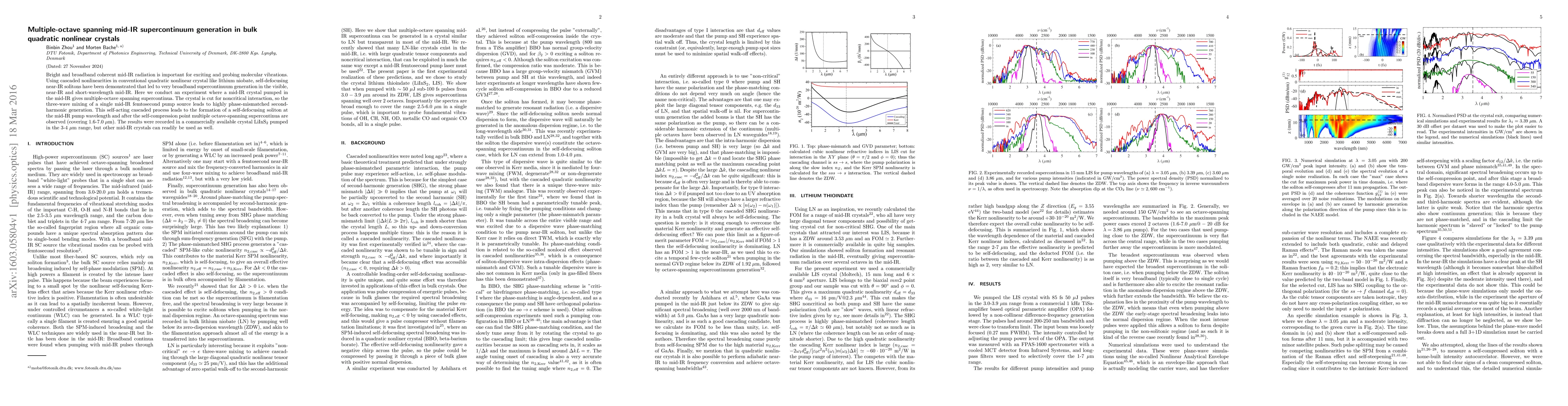 This paper demonstrates the generation of a multiple-octave spanning mid-IR supercontinuum in bulk quadratic nonlinear crystals, specifically LiInS$_2$, using a self-defocusing soliton process initiated by a mid-IR femtosecond pump source. The experiment shows supercontinua covering from 1.6 to 7.0 µm through cascaded nonlinearities and phase-mismatched second-harmonic generation.