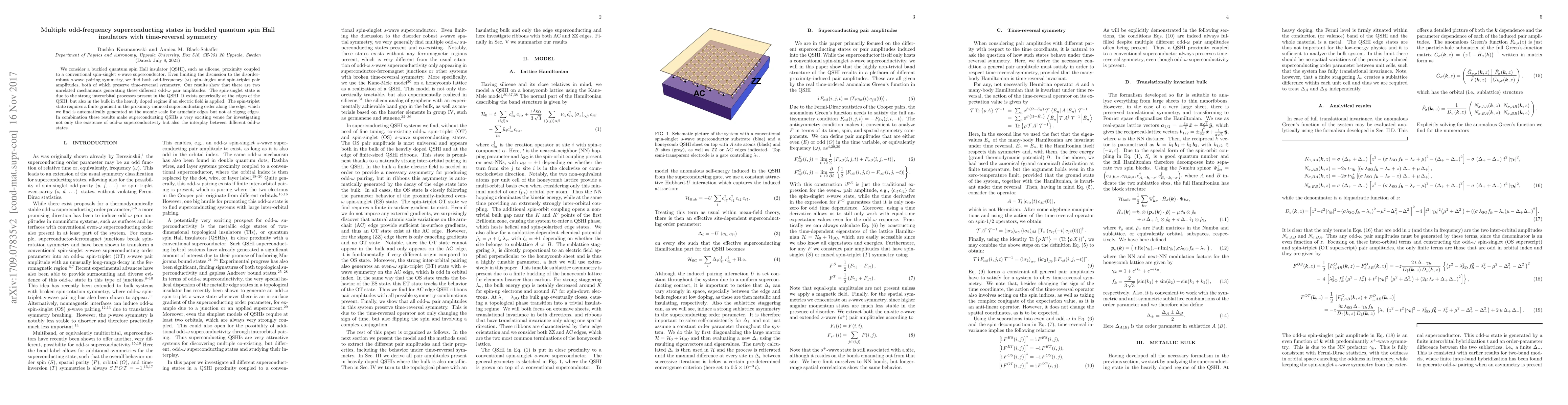 We consider a buckled quantum spin Hall insulator (QSHI), such as silicene, proximity-coupled to a conventional spin-singlet, s-wave superconductor. Even limiting the discussion to the disorder-robust s-wave pairing symmetry, we find both odd-frequency ($\omega$), spin-singlet and spin-triplet pair amplitudes and where both preserve time-reversal symmetry. Our results show that there are two unrelated mechanisms generating these different odd-$\omega$ pair amplitudes. The spin-singlet state is due to the strong inter-orbital processes present in the QSHI. It is exists generically at the edges of the QSHI, but also in the bulk in heavily doped regime if an electric field is applied. The spin-triplet state requires a finite gradient in the proximity-induced superconducting order along the edge, which we find is automatically generated at the atomic scale for armchair edges but not at zigzag edges. In combination these results make superconducting QSHIs a very exciting venue for investigating not only the existence of odd-$\omega$ superconductivity, but also the interplay between different odd-$\omega$ states.