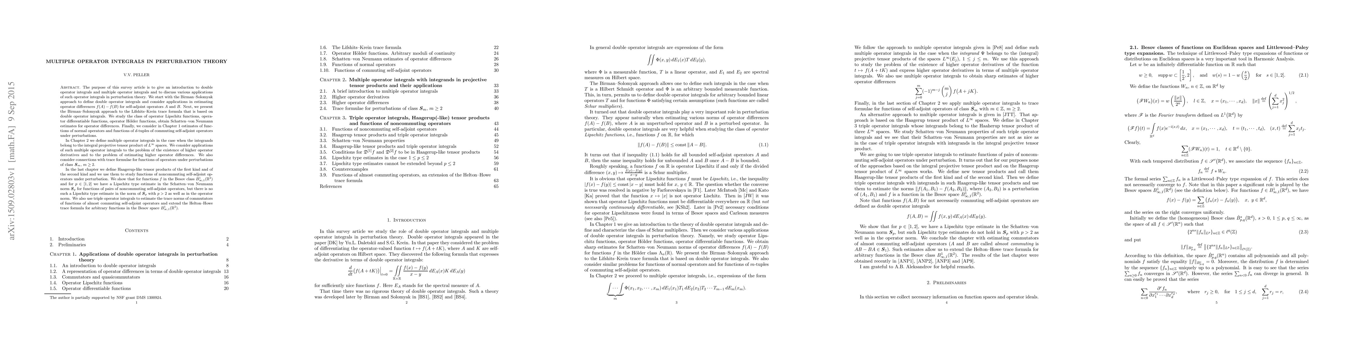We start with the Birman--Solomyak approach to define double operator integrals and consider applications in estimating operator differences $f(A)-f(B)$ for self-adjoint operators $A$ and $B$. We present the Birman--Solomyak approach to the Lifshits--Krein trace formula that is based on double operator integrals. We study the class of operator Lipschitz functions, operator differentiable functions, operator H\"older functions, obtain Schatten--von Neumann estimates for operator differences. Finally, we consider in Chapter 1 estimates of functions of normal operators and functions of $d$-tuples of commuting self-adjoint operators. In Chapter 2 we define multiple operator integrals with integrands in the integral projective tensor product of $L^\infty$ spaces. We consider applications of such multiple operator integrals to the problem of the existence of higher operator derivatives and to the problem of estimating higher operator differences. We also consider connections with trace formulae for functions of operators under perturbations of class $\boldsymbol{S}_m$, $m\ge2$. In the last chapter we define Haagerup-like tensor products of the first kind and of the second kind and we use them to study functions of noncommuting self-adjoint operators under perturbation. We show that for functions $f$ in the Besov class $B_{\infty,1}^1({\Bbb R}^2)$ and for $p\in[1,2]$ we have a Lipschitz type estimate in the Schatten--von Neumann norm $\boldsymbol{S}_p$ for functions of pairs of noncommuting self-adjoint operators, but there is no such a Lipschitz type estimate in the norm of $\boldsymbol{S}_p$ with $p>2$ as well as in the operator norm. We also use triple operator integrals to estimate the trace norms of commutators of functions of almost commuting self-adjoint operators and extend the Helton--Howe trace formula for arbitrary functions in the Besov space $B_{\infty,1}^1({\Bbb R}^2)$.