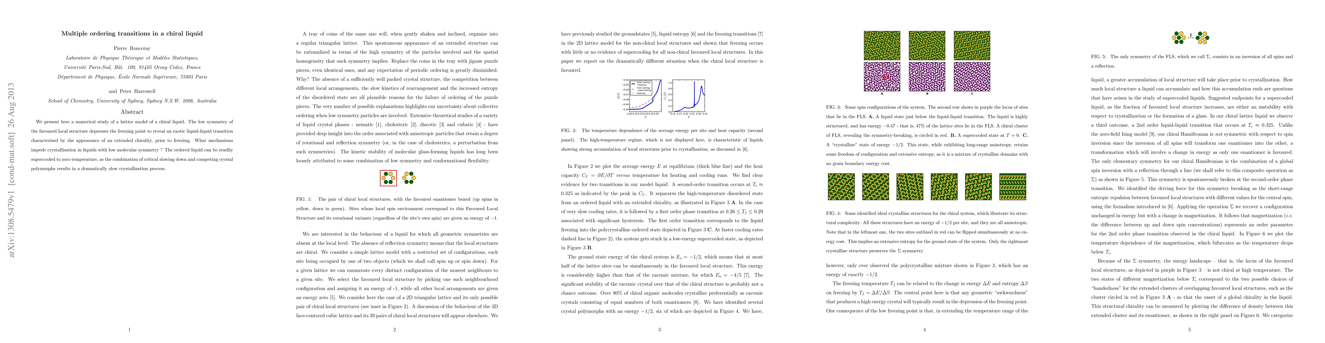 We present here a numerical study of a lattice model of a chiral liquid. The low symmetry of the favoured local structure depresses the freezing point to reveal an exotic liquid-liquid transition characterised by the appearance of an extended chirality,prior to freezing. What mechanisms impede crystallisation in liquids with low molecular symmetry ? The ordered liquid can be readily supercooled to zero temperature, as the combination of critical slowing down and competing crystal polymorphs results in a dramatically slow crystallisation process.
