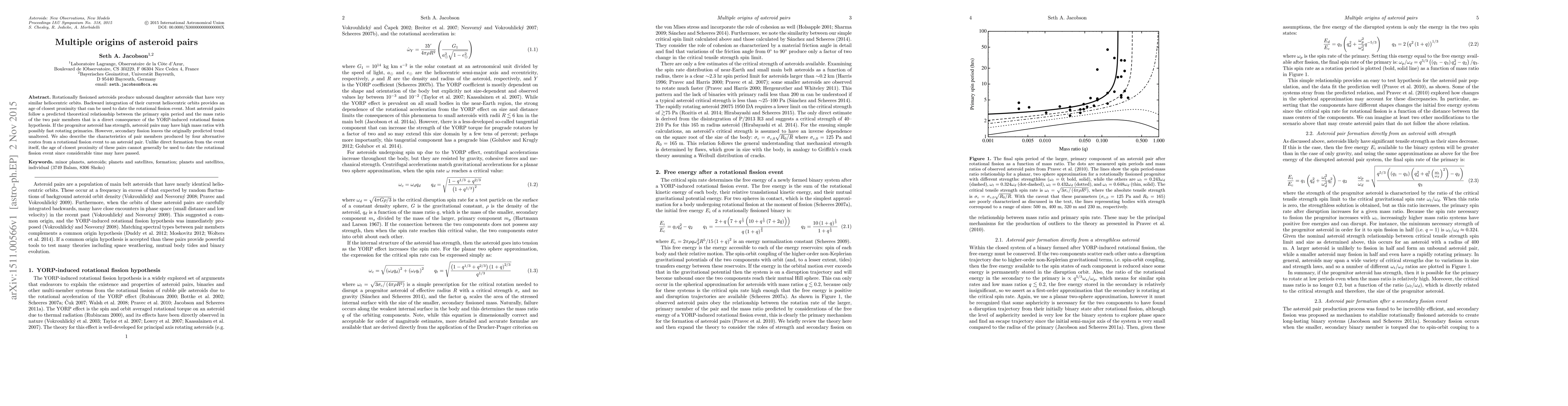 This paper investigates the origins of asteroid pairs, finding that most result from YORP-induced rotational fission, with pairs following a theoretical relationship between spin period and mass ratio. Secondary fission maintains this trend, but alternative formation routes do not allow for dating fission events due to potential time delays.
