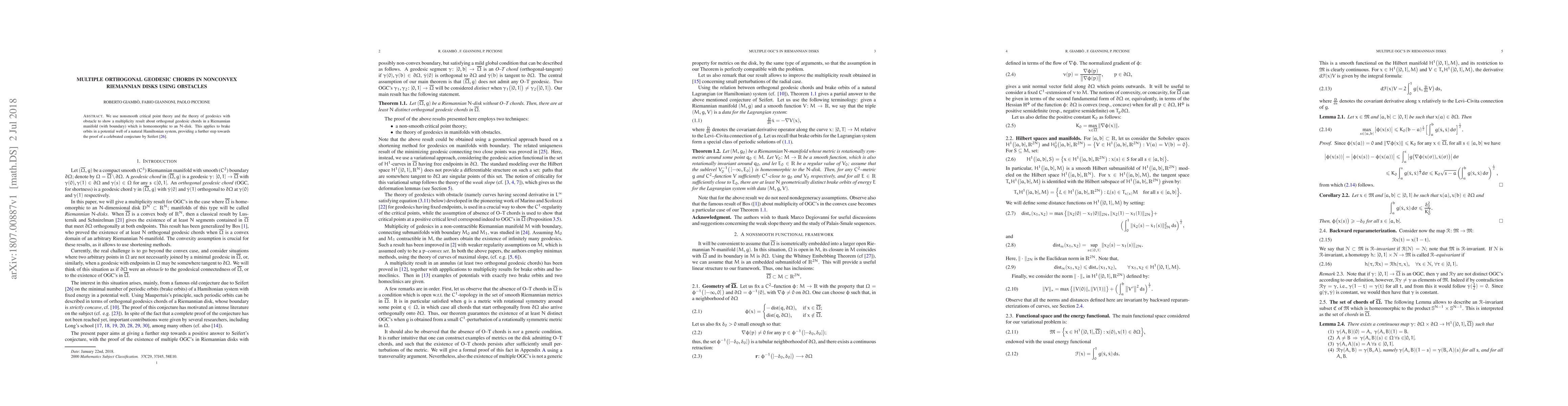 Summary: The paper employs nonsmooth critical point theory and geodesic obstacle theory to demonstrate the existence of multiple orthogonal geodesic chords in nonconvex Riemannian disks, contributing to the proof of Seifert's conjecture regarding brake orbits in Hamiltonian systems.