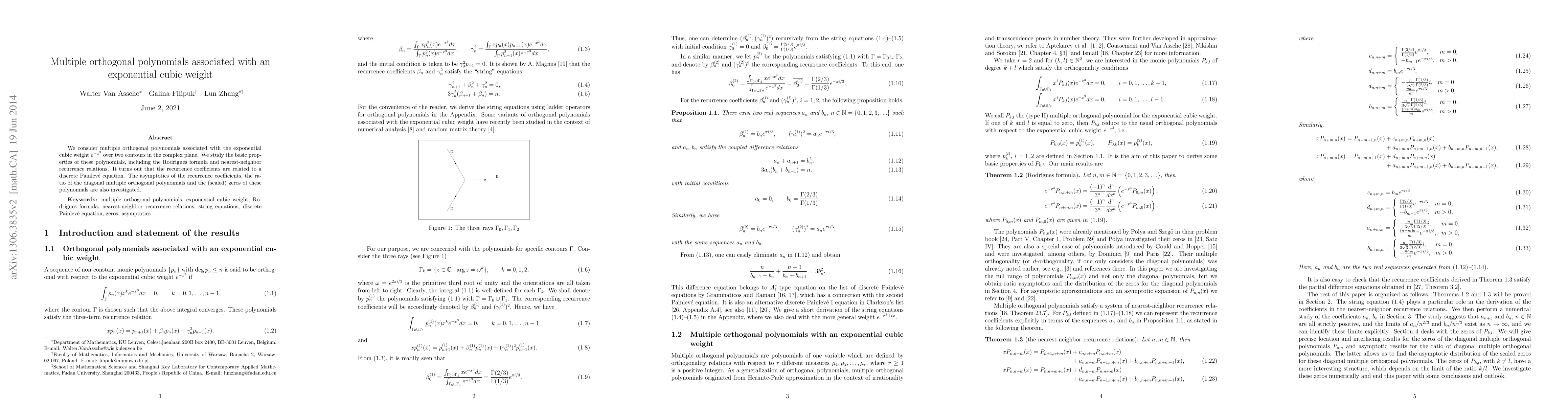 This paper explores multiple orthogonal polynomials with the exponential cubic weight \( e^{-x^3} \) over two complex contours, examining their properties, recurrence relations, and connections to a discrete Painlevé equation. It also investigates the asymptotics of recurrence coefficients and the ratios of these polynomials.