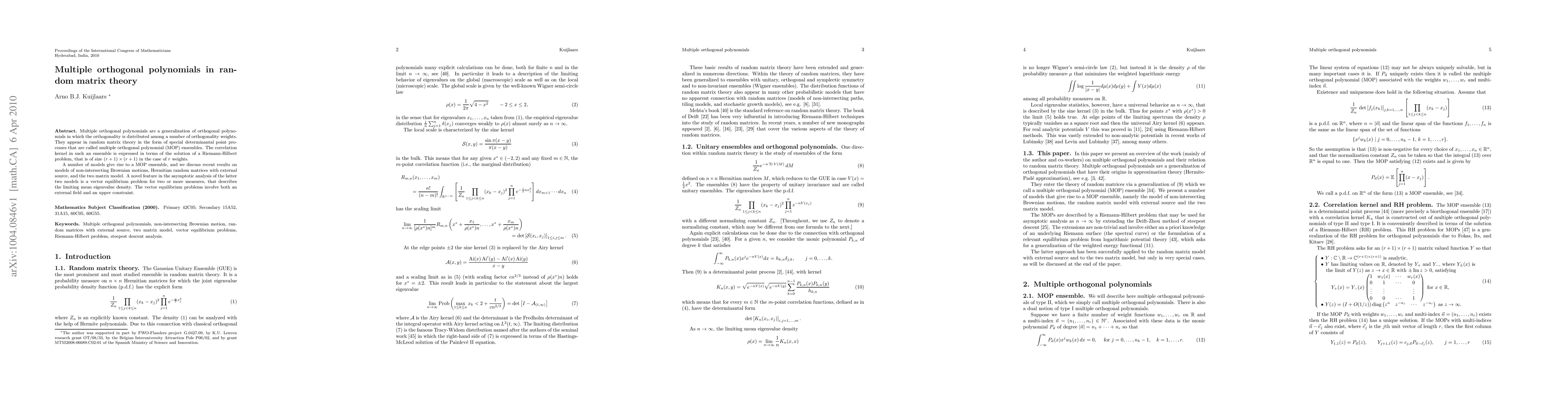 This paper explores multiple orthogonal polynomials in random matrix theory, focusing on special determinantal point processes known as MOP ensembles. It discusses recent findings on models like non-intersecting Brownian motions and Hermitian random matrices, highlighting novel vector equilibrium problems for analyzing the limiting mean eigenvalue density.