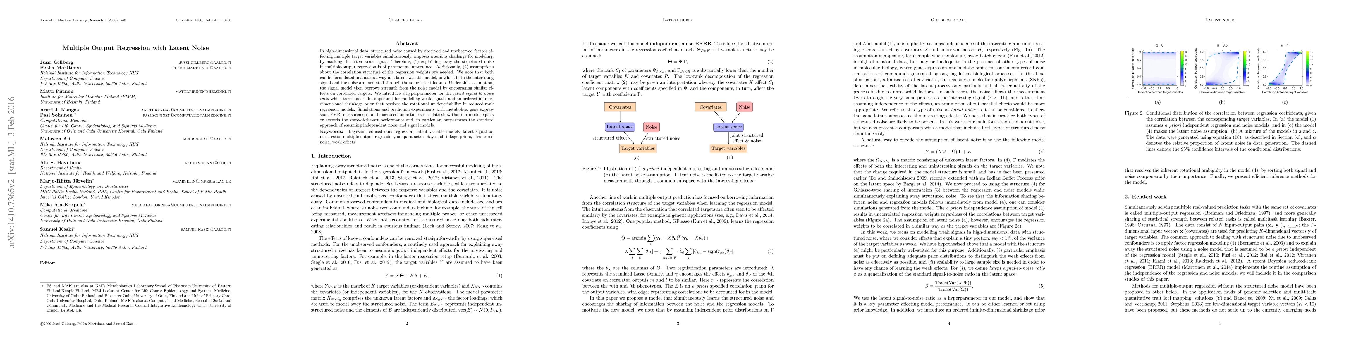 In high-dimensional data, structured noise caused by observed and unobserved factors affecting multiple target variables simultaneously, imposes a serious challenge for modeling, by masking the often weak signal. Therefore, (1) explaining away the structured noise in multiple-output regression is of paramount importance. Additionally, (2) assumptions about the correlation structure of the regression weights are needed. We note that both can be formulated in a natural way in a latent variable model, in which both the interesting signal and the noise are mediated through the same latent factors. Under this assumption, the signal model then borrows strength from the noise model by encouraging similar effects on correlated targets. We introduce a hyperparameter for the \emph{latent signal-to-noise ratio} which turns out to be important for modelling weak signals, and an ordered infinite-dimensional shrinkage prior that resolves the rotational unidentifiability in reduced-rank regression models. Simulations and prediction experiments with metabolite, gene expression, FMRI measurement, and macroeconomic time series data show that our model equals or exceeds the state-of-the-art performance and, in particular, outperforms the standard approach of assuming independent noise and signal models.